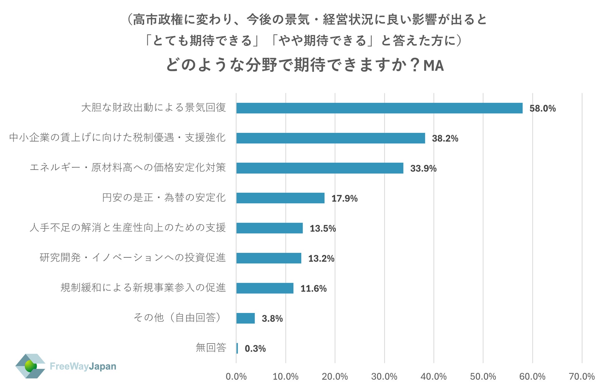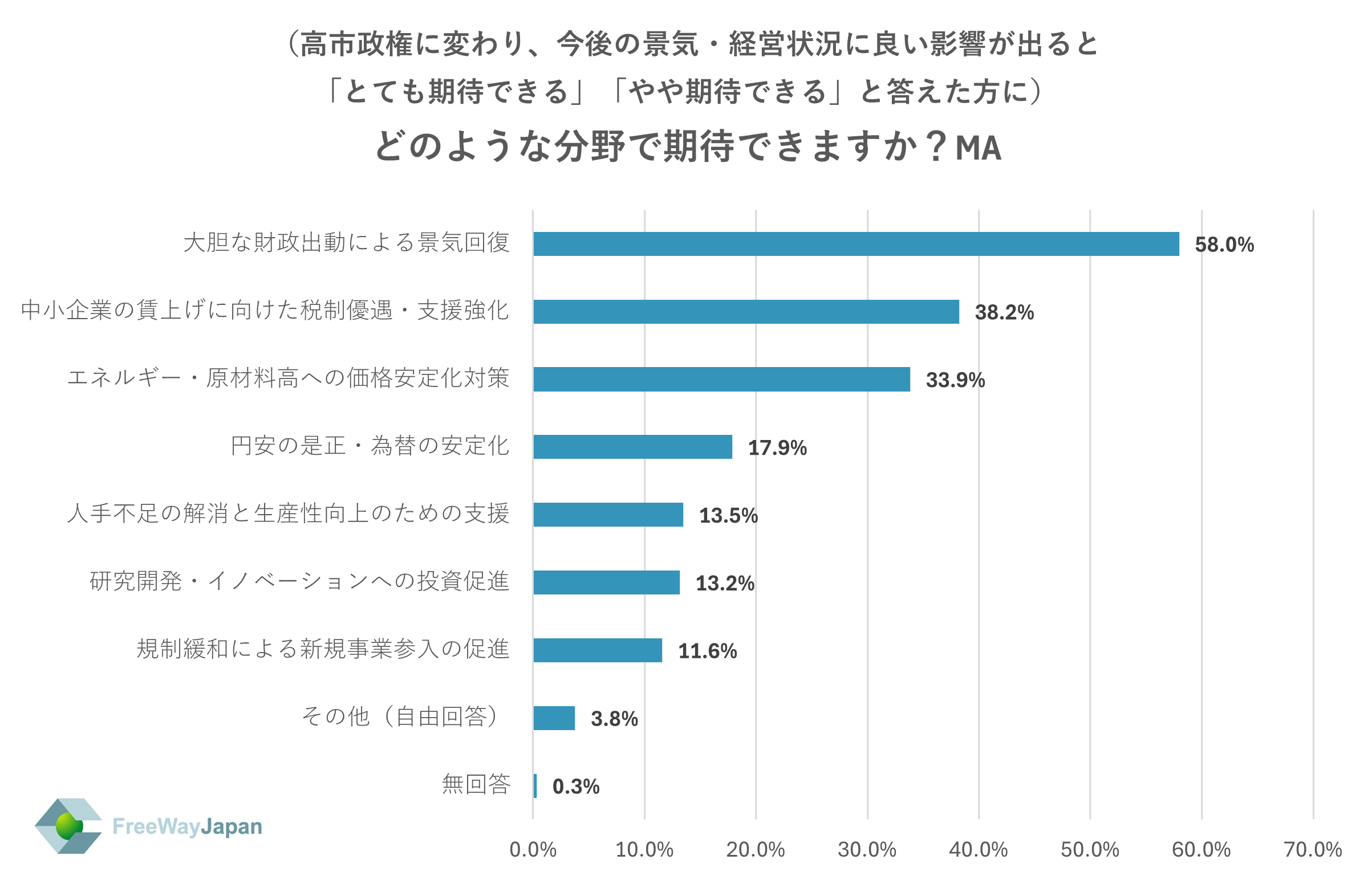 上記で「とても期待できる」「やや期待できる」と答えた方に、どのような分野で期待できるか聞いたところ、「大胆な財政出動による景気回復」が58.0%、「中小企業の賃上げに向けた税制優遇・支援強化」が38.2%、「エネルギー・原材料高への価格安定化対策」が33.9%、「円安の是正・為替の安定化」が17.9%、「人手不足の解消と生産性向上のための支援」が13.5%、「研究開発・イノベーションへの投資促進」が13.2%、「規制緩和による新規事業参入の促進」が11.6%、その他(自由回答)が3.8%、無回答が0.3%という結果だった。