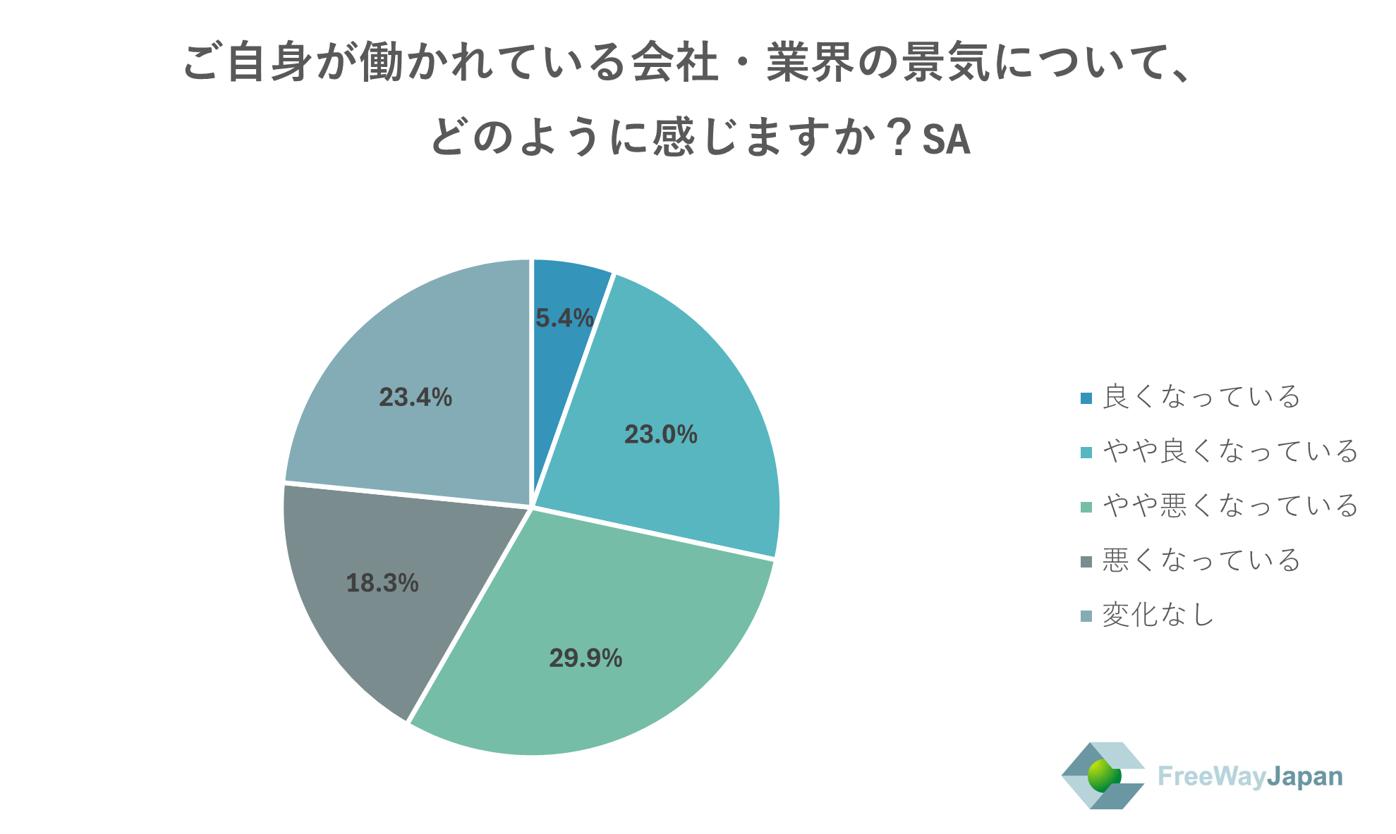 自身が働いている会社・業界の景気について、どのように感じるか聞いたところ、「やや悪くなっている」が29.9%、「変化なし」が23.4%、「やや良くなっている」が23.0%、「悪くなっている」が18.3%、「良くなっている」が5.4%という結果だった。