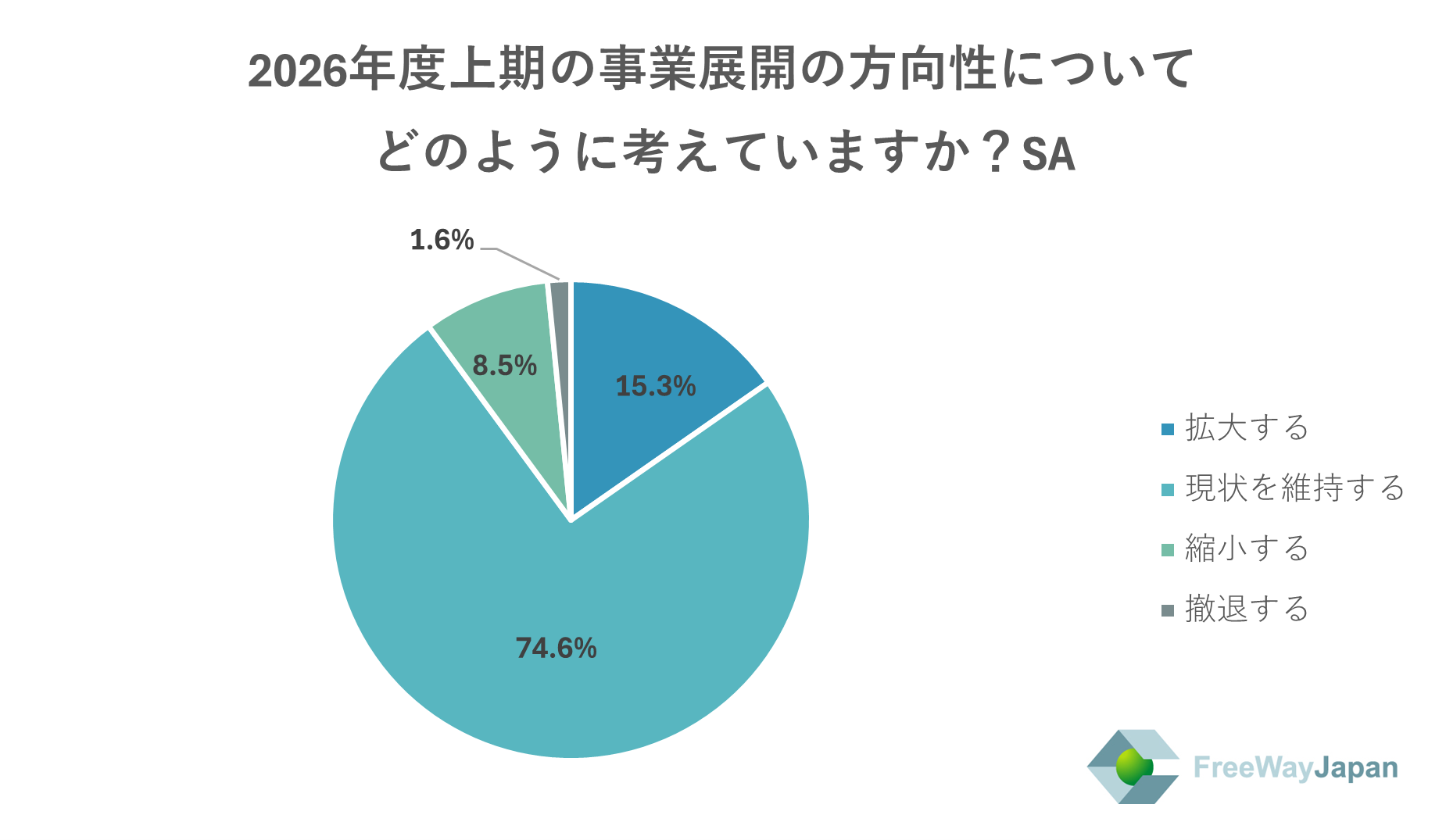 2026年度上期の事業展開の方向性を聞いたところ、「現状を維持する」が74.6%、「拡大する」が15.3%、「縮小する」が8.5%、「撤退する」が1.6%という結果だった。