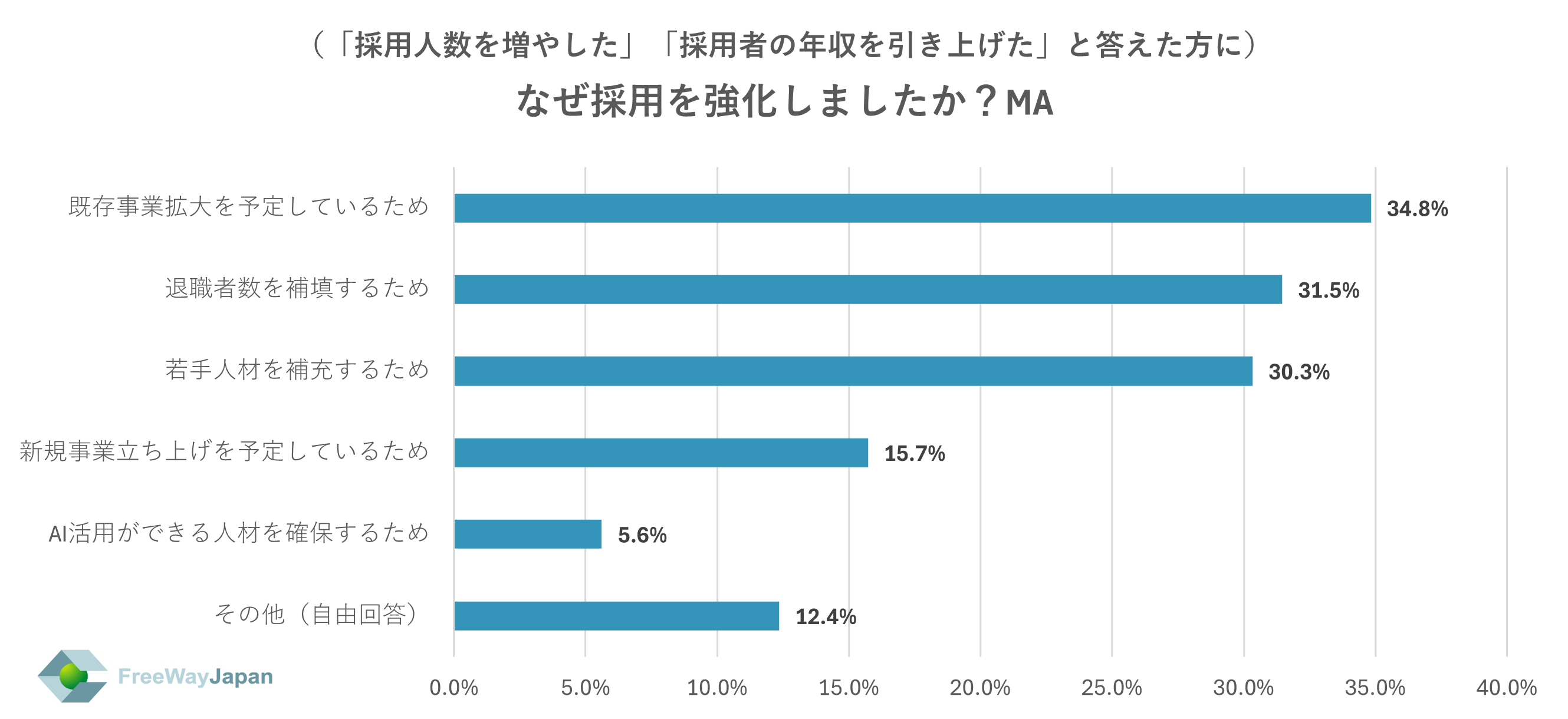 上記で「採用人数を増やした」「採用者の年収を引き上げた」と答えた方に、なぜ採用を強化したか聞いたところ、「既存事業拡大を予定しているため」が34.8%、「退職者数を補填するため」が31.5%、「若手人材を補充するため」が30.3%、「新規事業立ち上げを予定しているため」が15.7%、「AI活用ができる人材を確保するため」が5.6%、その他(自由回答)が12.4%という結果だった。