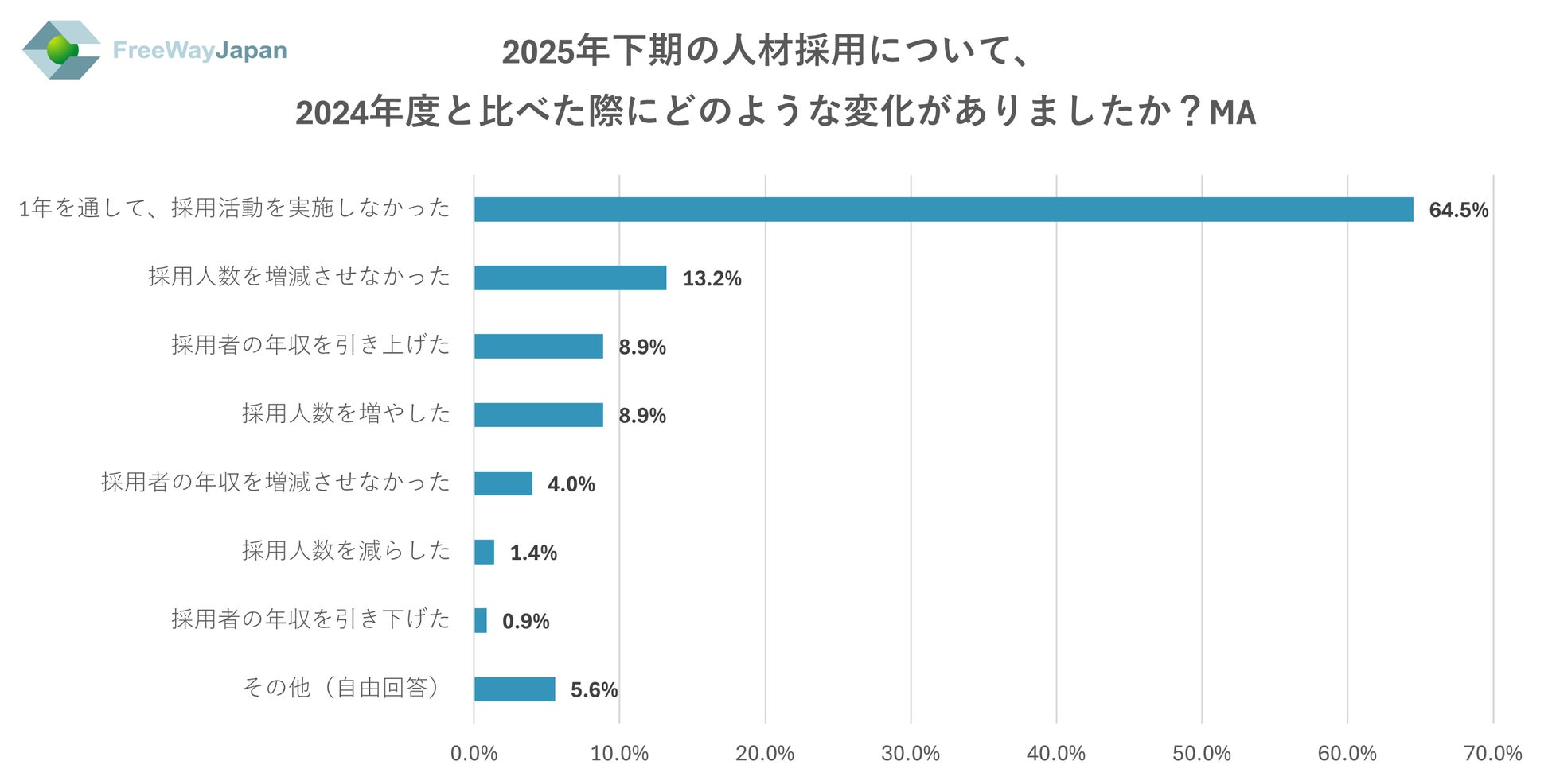 2025年下期の人材採用について、2024年度と比べた際にどのような変化があったか聞いたところ、「1年を通して、採用活動を実施しなかった」が64.5%、「採用人数を増減させなかった」が13.2%、「採用者の年収を引き上げた」「採用人数を増やした」がそれぞれ8.9%、「採用者の年収を増減させなかった」4.0%、「採用人数を減らした」が1.4%、「採用者の年収を引き下げた」が0.9%、その他(自由回答)が5.6%という結果だった。