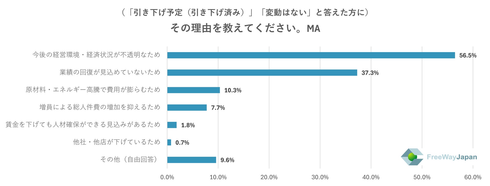 一方、賃金を「引き下げ予定(引き下げ済み)」「変動はない」と答えた方に理由を聞いたところ、「今後の経営環境・経済状況が不透明なため」が56.5%、「業績の回復が見込めていないため」が37.3%、「原材料・エネルギー高騰で費用が膨らむため」が10.3%、「増員による総人件費の増加を抑えるため」が7.7%、「賃金を下げても人材確保ができる見込みがあるため」が1.8%、「他社・他店が下げているため」が0.7%、その他(自由回答)が9.6%という結果だった。