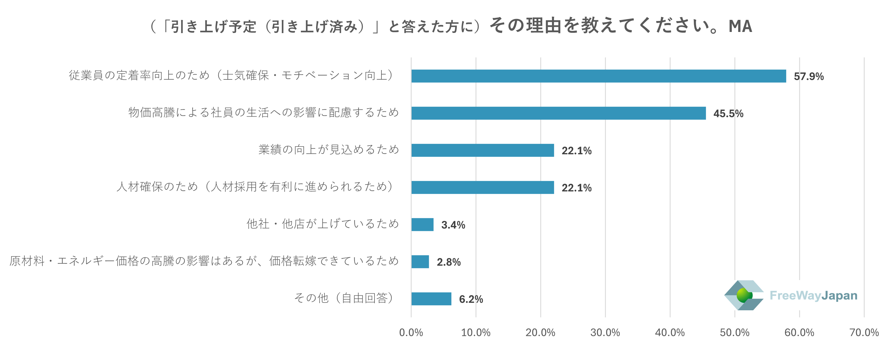 上記で賃金を「引き上げ予定(引き上げ済み)」と答えた方に、その理由を聞いたところ、「従業員の定着率向上のため(士気確保・モチベーション向上)」が57.9%、「物価高騰による社員の生活への影響に配慮するため」が45.5%、「業績の向上が見込めるため」「人材確保のため(人材採用を有利に進められるため)」が22.1%、「他社・他店が上げているため」が3.4%、「原材料・エネルギー価格の高騰の影響はあるが、価格転嫁できているため」が2.8%、その他(自由回答)が6.2%という結果だった。