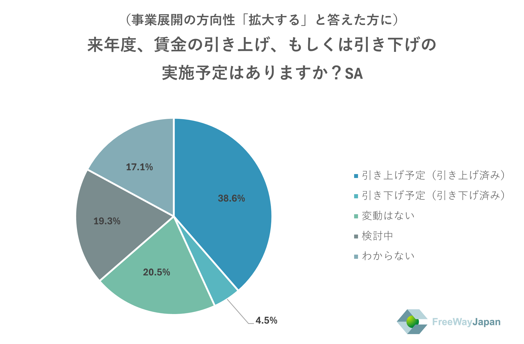 また、上記について、事業展開の方向性として「拡大する」と回答した方に絞って結果を見ると、「引き上げ予定(引き上げ済み)」が38.6%、「変動はない」が20.5%、「検討中」が19.3%、「わからない」が17.1%、「引き下げ予定(引き下げ済み)」が4.5%という結果だった。