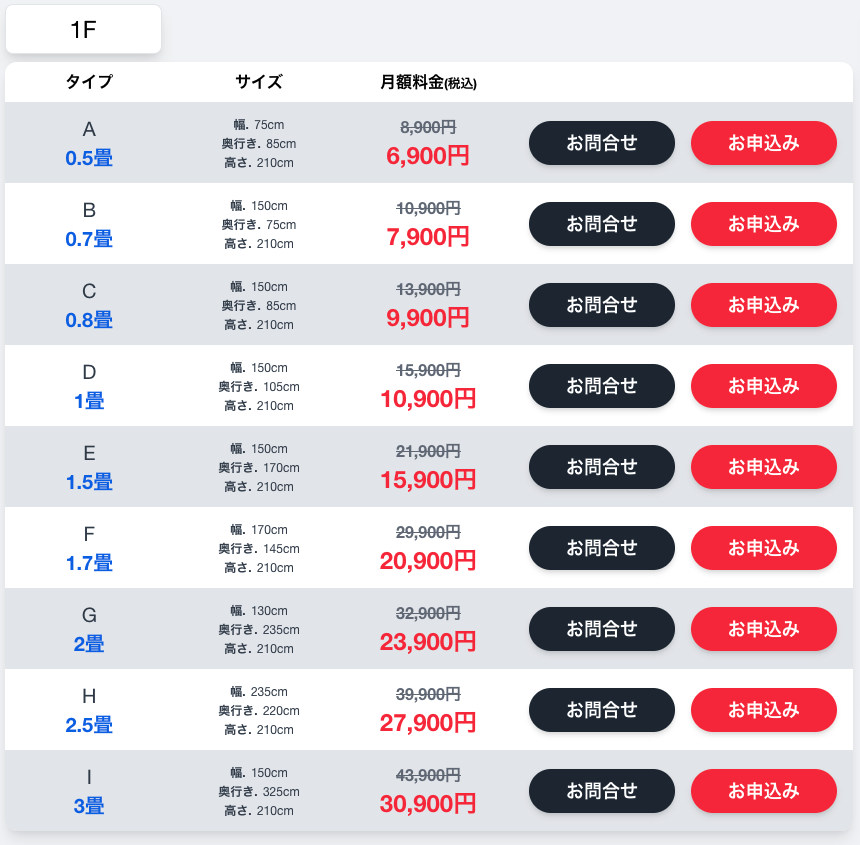 部屋タイプとサイズ、月額料金はこちら