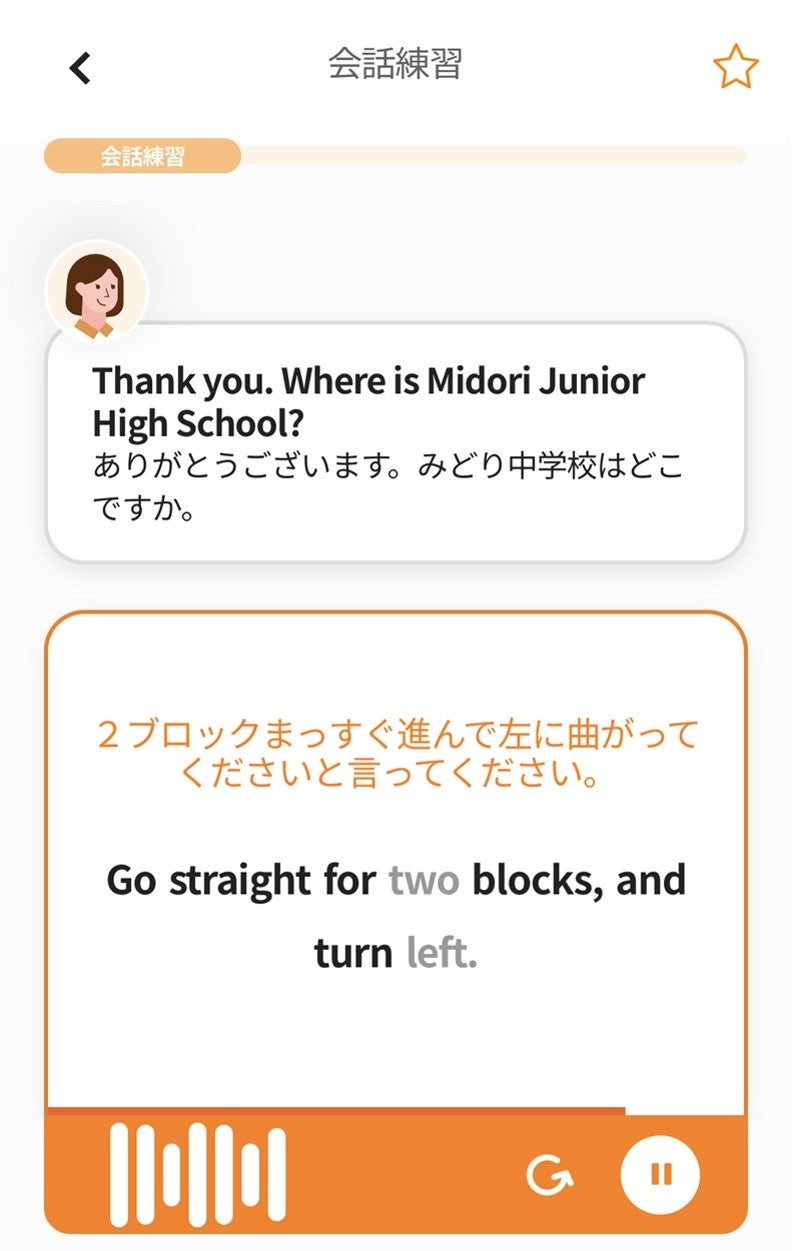 ・「自己紹介をする」「道案内をする」など、学校での学習内容に合わせたさまざまな場面設定で英会話練習ができます。1レッスンあたり10分程度の短時間で重要表現を学習でき、「好きなスポーツについて話す」などフリートークも可能なため、実際に人と話をしている感覚で実践的に英会話のスキルを習得できます。