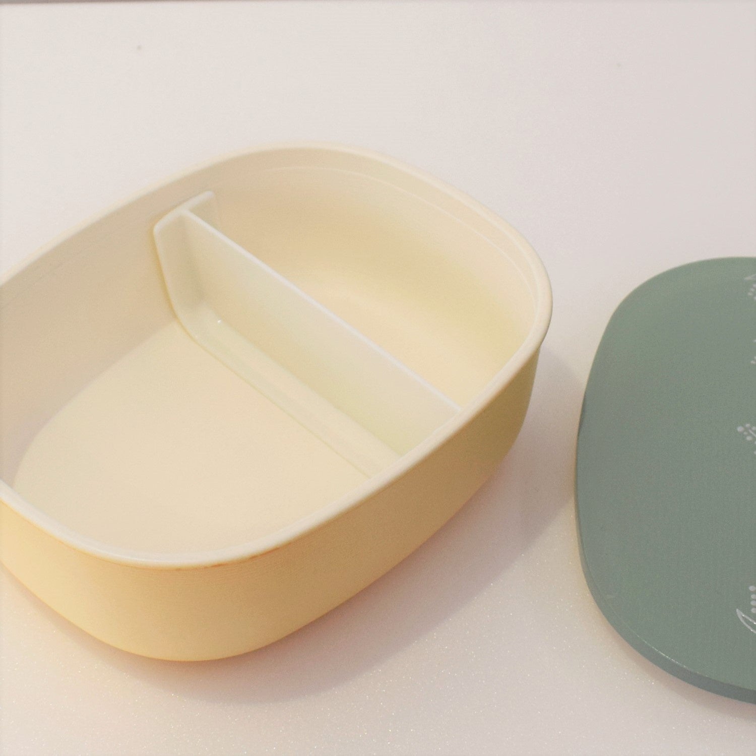 容器の深さ約5cm、仕切り付きでご飯とおかずを分けて盛り付けられます。