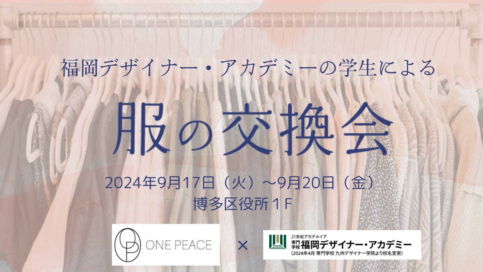 レディースアパレル通販を運営する株式会社ワンピース(本社:兵庫県加古川市、代表取締役:春木晃子。以下ワンピース)は、博多区役所にて2024年9月17日~20日に開催される、福岡デザイナー・アカデミーの学生による『服の交換会』の活動に協賛しております。ワンピースが提供するサービス『服の交換会』をパッケージ化し、学校や施設での導入や自主開催を支援することで『服の交換会』開催を全国各地に広げ、服を手放す際の選択肢に「交換」が当たり前の文化をつくり循環する社会を目指しています。