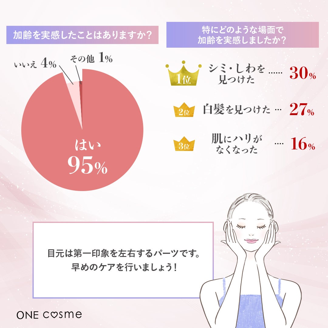 回答者の95%が加齢を実感したことがあると回答。加齢を感じた場面や目元悩み、目元ケア方法について調査しました。