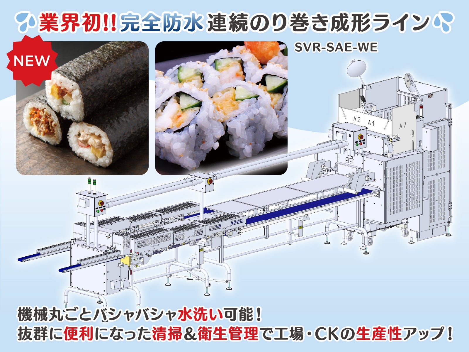 業界初の完全防水のり巻きライン「SVR-SAE-WE」をはじめ、新型「ESSライン+海苔付け機」による連携デモでは、今市場でも人気“ふんわり・ふっくらタイプ”のおむすびを製造・ご試食いただける実演展示も予定しております。弁当容器にふっくらしたご飯の盛付けや機械化が苦手な和惣菜を盛付けできる新製品なども展示いたします。