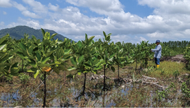 地球温暖化による影響が世界各地で顕在化する中、二酸化炭素の吸収源としてマングローブへの注目が高まっています。森林には二酸化炭素を吸収・固定する能力がありますが、その量で比較してみると、スギ人工林が1haあたり約302tなのに対し、マングローブは799~1,283tにも及びます。常夏の東南アジアでは30~40mの大きさにまでマングローブが育ちます。木は炭素の塊のため大きければ大きいほど、多くの二酸化炭素を吸収・固定することができます。また、マングローブは沿岸域に生息するため東南アジアには広大な植林面積があり、日本よりも東南アジアで植林を行う方が二酸化炭素削減により貢献できます。また、マングローブは海と陸の間にあり、津波や高波の被害を軽減する防災機能を備えています。独特の形状をした根元は水辺の生物の棲み家となり、豊かな生態系を育みます。ここで育つエビや魚は、地元の人々の貴重な収入源ともなりますし、食料安全保障の観点でも重要な役割を果たします。