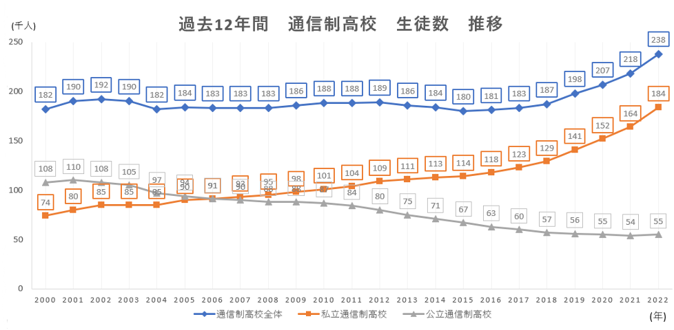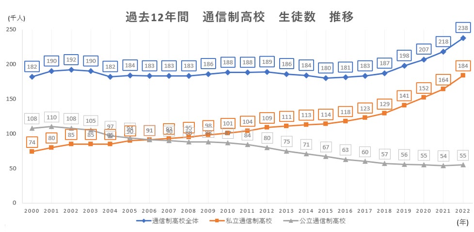 ●2022年、全日制は300万人(91%)、定時制は8万人(2%)。通信制の生徒数は23万人(7%) 以上。