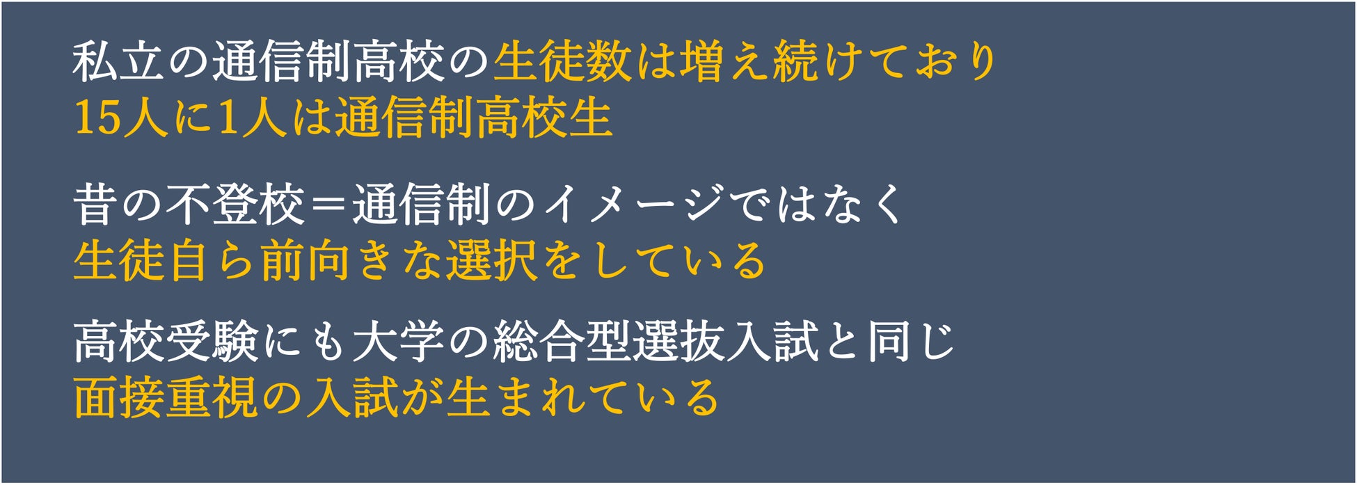 なぜ、通信制高校生が、15人に1人まで増えたのか?なぜ、筆記試験のない、面接だけの高校入試が生まれたのか?