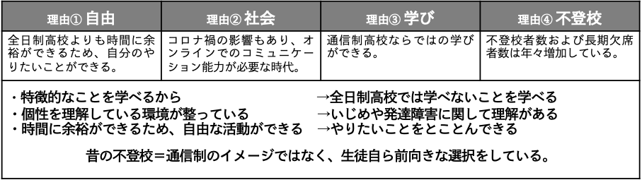 2015年から急激に私立の通信制高校の生徒数は増え続けており、2022年では、14~15に1人は通信制高校の生徒で、1クラスに2人は通信制高校を卒業するスケールです。いまや通信制高校は、旧来のイメージにある不登校=通信制ではなく、生徒自ら前向きな選択をしています。