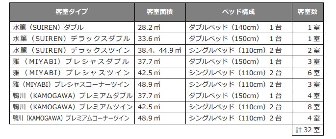 全32室、すべてのお部屋に自家源泉の露天風呂をご用意いたしました。全室が東山側に面し、2階以上のお部屋には専用テラスを備え、自然の風を感じながらゆったりと流れる時間をお楽しみいただけます。また、高層階のテラスからは当ホテル自慢の東山を望むパノラマを客室からも室内露天風呂からもご覧いただけます。1階のお部屋には、窓の外にウォーターフォールを設け、やさしい光が照らす隠れ家的空間が広がります。「和」の内装は、ゆるやかな鴨川の流れと漂う花風をモチーフに散りばめ、訪れた先々の余韻とともに心地よくお過ごしいただけます。