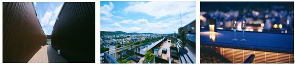 京都の路地をイメージした「天空の回廊」を抜けるとそこには屋上を大胆に開放した「空庭テラス」が広がります。ご宿泊のお客様はどなたでもご利用いただくことができ、鴨川から清水寺、東山までを望む大パノラマを、地上約31mのゆったりとした空間で存分にご堪能いただけます。