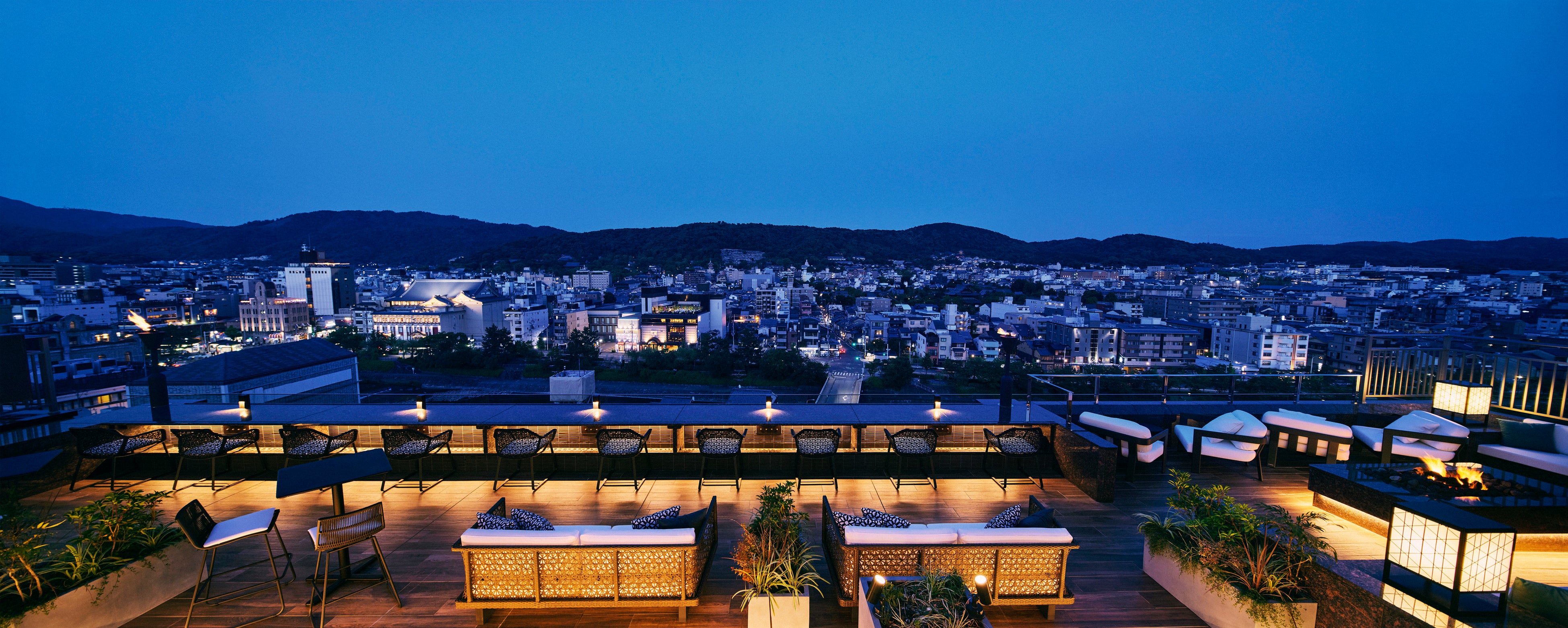 テーブル席・ソファ席のほか、足湯をお楽しみいただけるカウンター席も配し、朝は東山から昇る朝陽を浴び、昼は足湯で疲れを癒し、夕刻はかがり火・暖炉のゆらぐ灯りを感じながらウェルカムドリンクで寛ぎ、夜は「空庭ルーフトップBAR」で、京の月夜と共に大切な方とのひと時をお楽しみいただくなど、お客様お一人おひとりの特別な時間を空庭テラスにてお過ごしください。