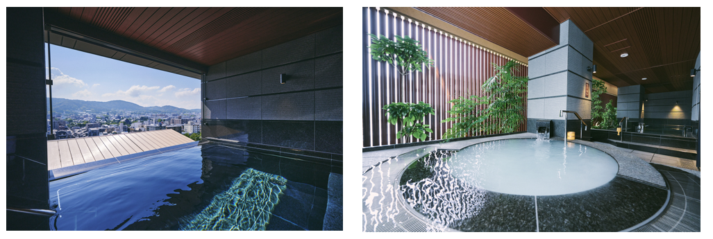 歴史と伝統ある古都京都でも中心地となる当エリアにおいて希少な自家源泉を掘削し、その温泉を最上階の9階まで汲み上げた源泉露天風呂には、深さ1.2mの深湯もご用意いたしました。深湯は、お湯の水圧を体全体に感じマッサージ効果を楽しめます。泉質はナトリウム・カルシウム・マグネシウムを含む塩化物温泉で、「熱の湯」と呼ばれるほど保温効果が高く、その効果は入浴中だけでなく入浴後も続くことが明らかにされています。「八坂の湯」は、東山の大パノラマを望む絶景をお楽しみいただけます。「庭の湯」は、やわらかな光に包まれた落ち着いた空間が広がります。さらに、両露天風呂には、「シルキージャグジーバス」も備え、マイクロバブルを発生させた乳白色の湯は、美肌の湯として知られ、保湿効果が高く、肌を健やかに保つと言われております。京都旅を満喫されたお客様の疲れを癒し、次の日も気持ちよくお目覚めいただける、贅沢な温泉をご堪能ください。