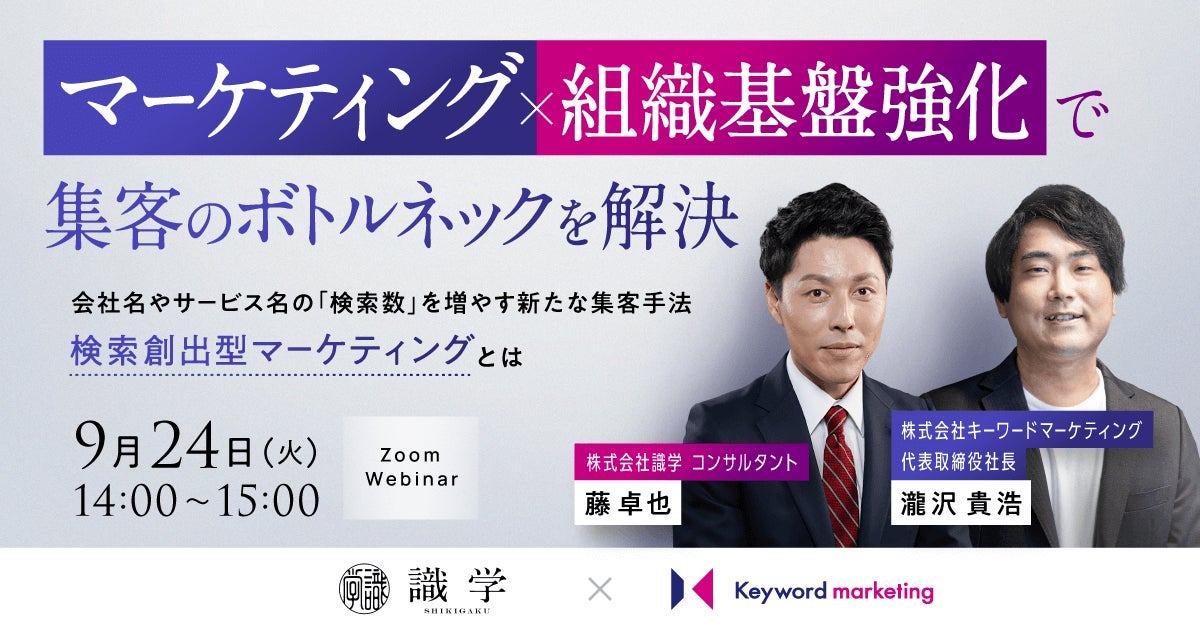 株式会社ベクトル(本社:東京都港区、代表取締役会長兼社長:西江 肇司、東証プライム:6058)の子会社である株式会社キーワードマーケティング(本社:東京都港区、代表取締役会長:滝井 秀典)は、株式会社識学(本社:東京都品川区、代表取締役社長:安藤 広大、以下 識学)と共同で、無料オンラインセミナー『マーケティング×組織基盤強化で集客のボトルネックを解決 会社名やサービス名の「検索数」を増やす新たな集客手法 検索創出型マーケティングとは』を9月24日(火)14時より開催いたします。