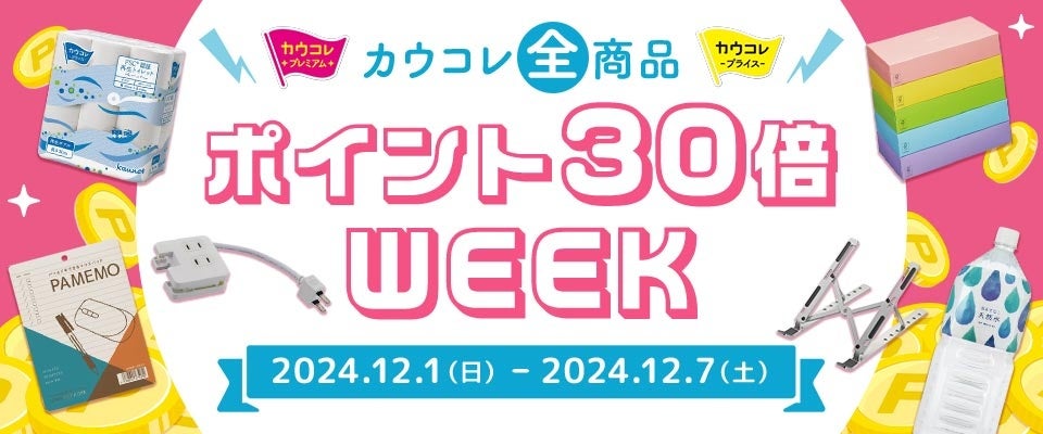 コクヨグループでEコマースサービスを提供する株式会社カウネット(本社:東京都港区/代表取締役社長:宮澤典友、以下「カウネット」)は、日頃のご愛顧に感謝を込めて、2024年12月1日(日)から12月7日(土)まで、カウネットWebサイトにおいて個人会員様限定の特別キャンペーン「カウコレ全商品ポイント30倍WEEK」を実施します。