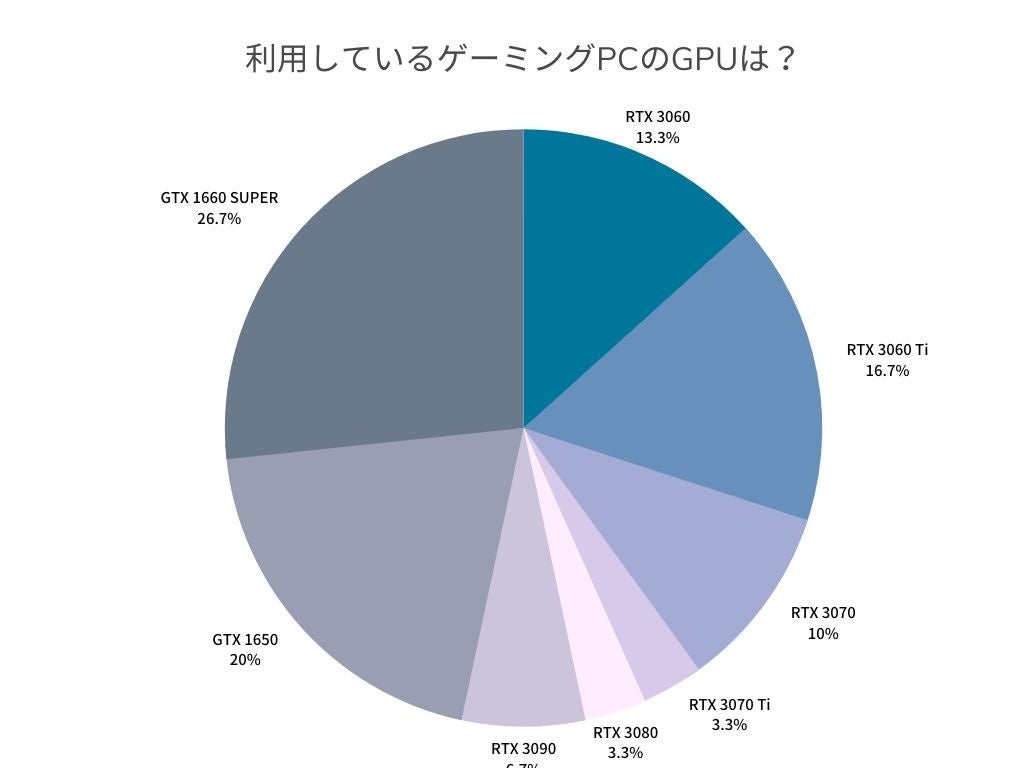 ミドルスペックGPUのなかでも比較的安価な「GTX 1660 SUPER」が1位、更に価格を抑えた「GTX 1650」が2位、ゲーミングPC売れ筋ランキングでも上位に食い込む「RTX 3060 Ti」が3位という結果になりました。