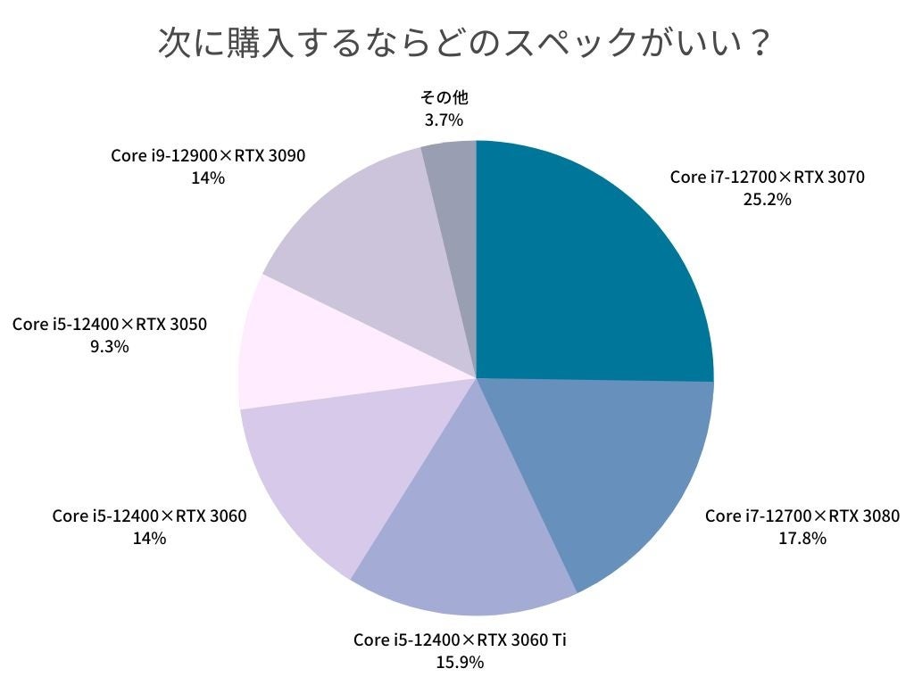 3位はコスパ重視の人気構成「Core i5-12400×RTX 3060 Ti」。価格と性能のバランスがよい構成が好まれることが本アンケートで分かりました。