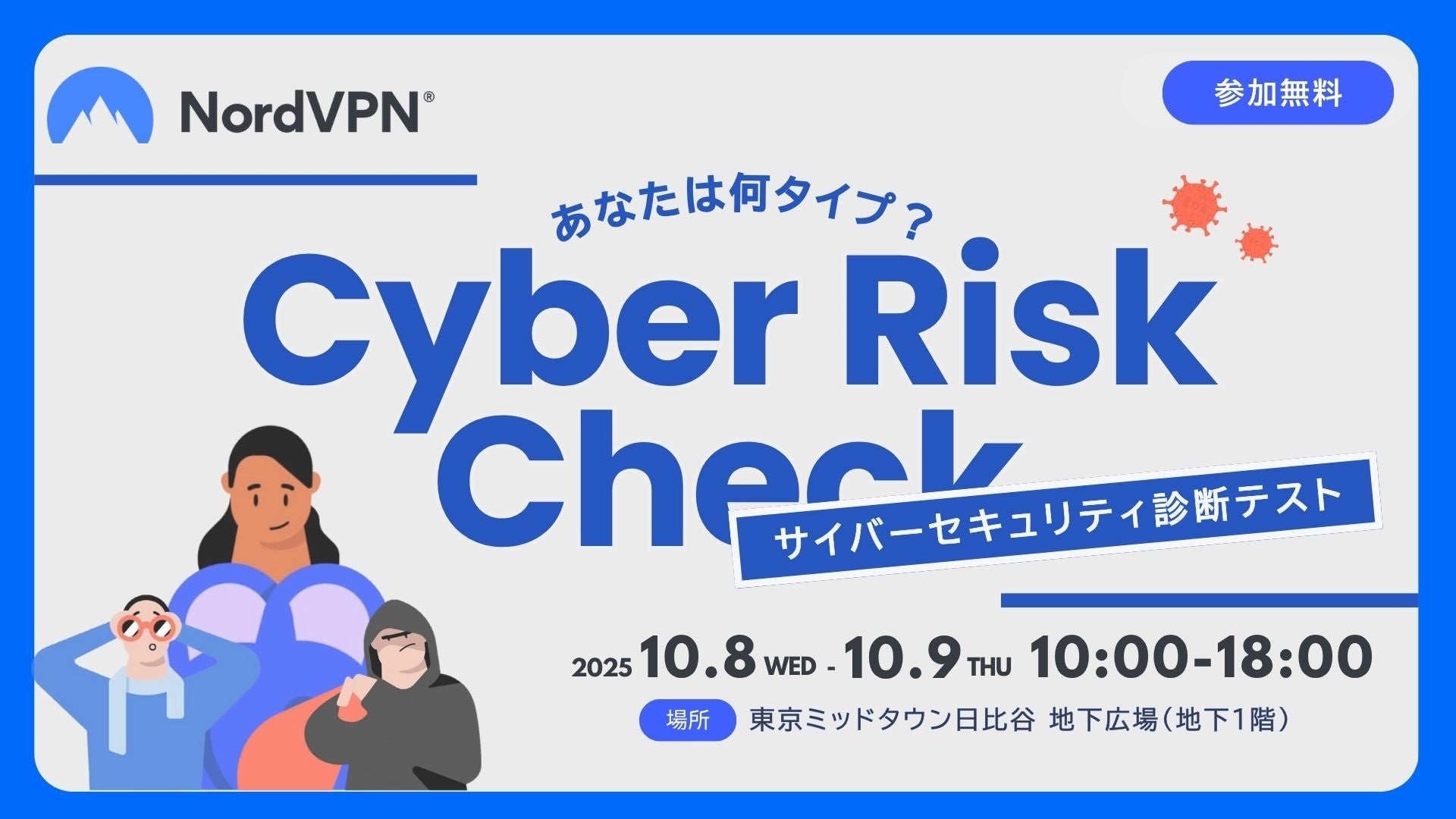 個人向けセキュリティサービスを提供するNordVPN(本社:オランダ・アムステルダム、日本代表:小原拓郎)は、2025年10月8日(水)・9日(木)の2日間、東京ミッドタウン日比谷 地下広場(地下1階)にて、ビジネスパーソンを対象としたセキュリティ啓発イベント「Cyber Risk Check― あなたは何タイプ? セキュリティリスク診断テスト」を開催します。