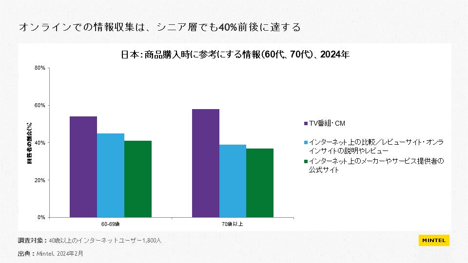 そして、日本の高齢者層の多くは、既に情報収集の手段の一つとしてオンラインの活用を受け入れています。ミンテルジャパンレポート「シニアのライフスタイル - 日本 - 2024年」でも述べられているように、シニア層(60歳以上)では、商品購入の際に参考とする情報源として、オンラインを挙げる回答は40%前後に達し、最も多い情報源のテレビに次ぐ回答となっています。彼らの直近1年間の支出の変化を見ると、飲食やヘルスケアなどの支出が伸びています。これらに関連する情報の収集においても、インフルエンサーを活用した説得力のある情報が提供された場合、新たな情報源としてインフルエンサーを認知するシニア世代の増加につながるでしょう。