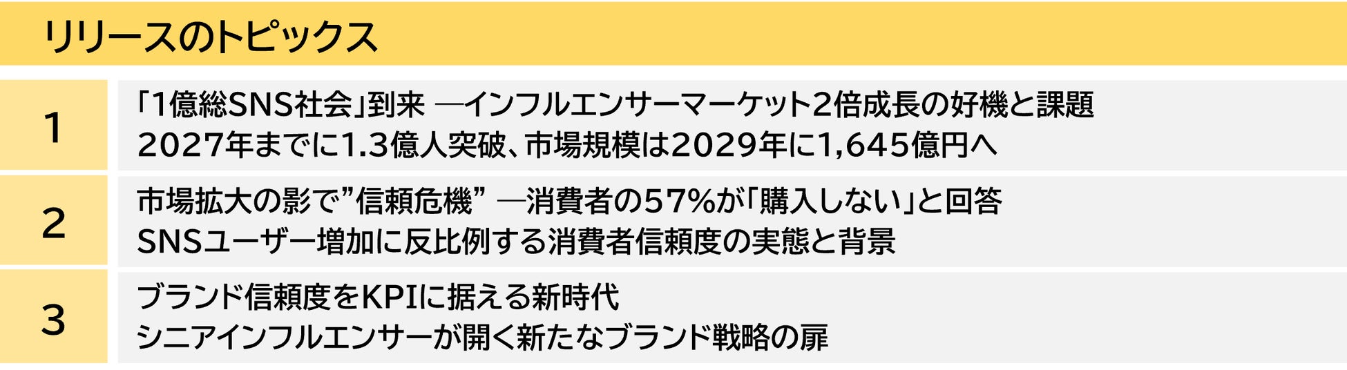この変革期において「認知」から「購入」へと消費者を導く新たなインフルエンサー戦略の構築が企業に求められています。高齢化が進む日本の特性を強みに変える、専門性と信頼性を核としたインフルエンサーマーケティングの展開が、企業の成長を左右する重要なビジネスチャンスとなっています。