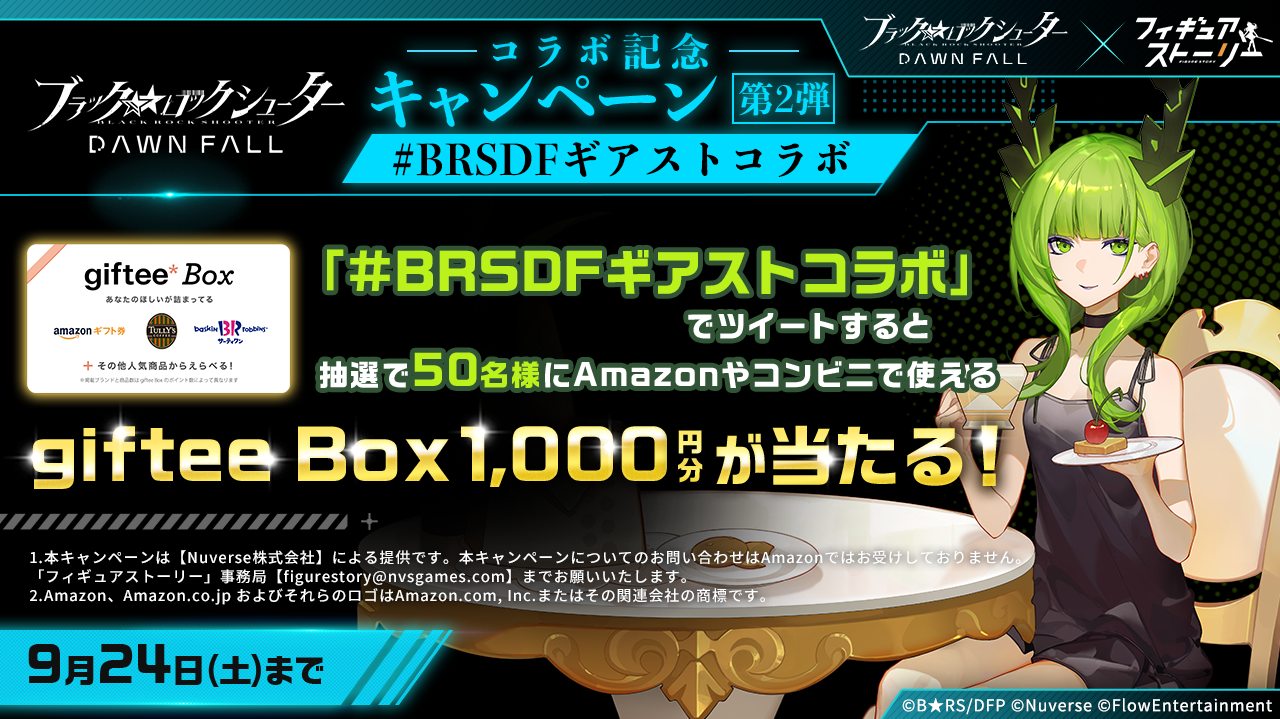 内容:ギアスト公式Twitterアカウントをフォローし、「#BRSDFギアストコラボ」を付けたツイートで応募完了。Amazonやコンビニエンスストア、その他人気のお店で使用できるデジタルギフト「giftee Box」1,000円分を50名に抽選でプレゼント!