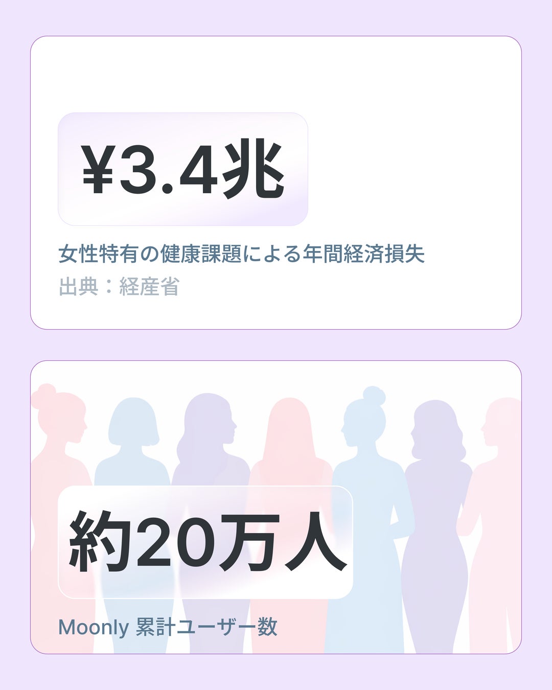 Moonly — コンシューマー向けAIヘルスケアアプリ。月経・排卵予測、妊活サポート、妊娠期のケアなど、女性のライフステージに応じた機能を提供。約20万人のユーザーから蓄積されたデータを有し、様々な業界で利活用しています。