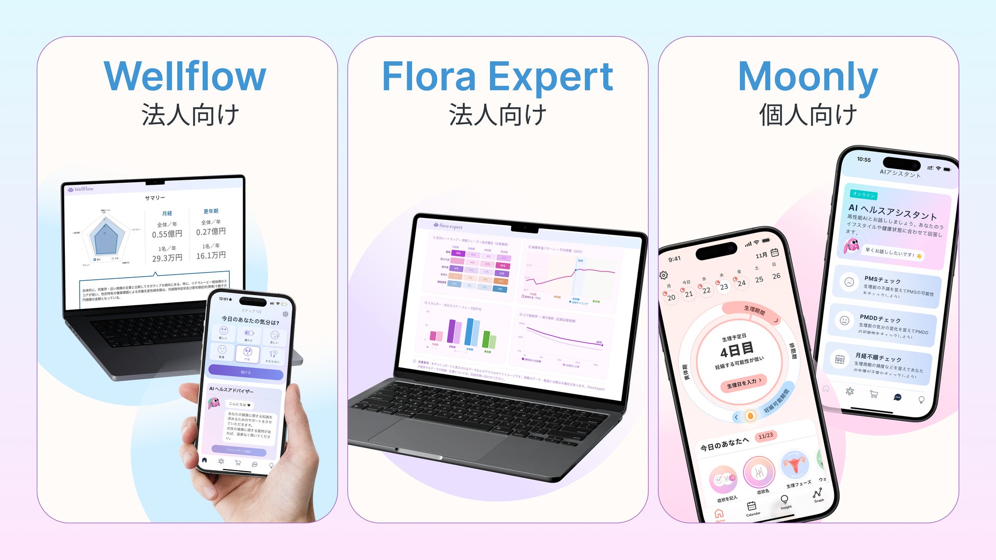 法人向けフェムテックサービス「Wellflow」では、従来分断されていた健康支援・キャリア支援・職場環境改善を一つのプラットフォームで一気通貫に提供し、「Flora Expert」では従来の調査やマーケティングにおいて課題となりやすいバイアスや属人的な解釈を抑え、データに基づく客観的かつ再現性のある意思決定を可能にします。また、コンシューマー向けアプリ「Moonly」は韓国・台湾を含むアジア市場で成長を続けています。