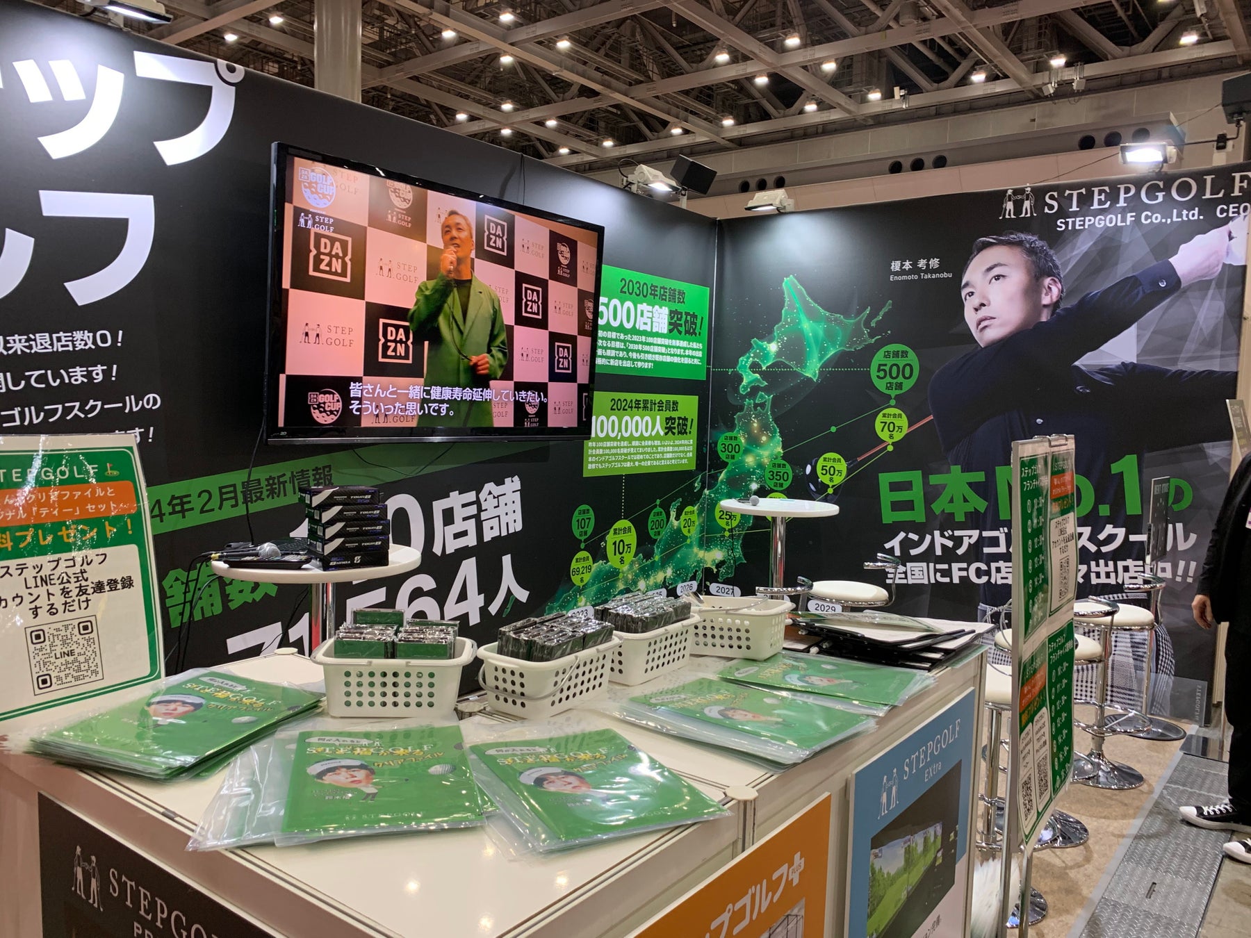 3日間開催された「フランチャイズ・ショー2024」は、同時開催の店・食・観光 トレンド展 2024、Good 家電 Expo 2024と合わせて合計27997人(※)の来場となる大盛況なイベントとなりました。ステップゴルフの出展ブースではエグゼクティブコーチの吉田一尊やコー
