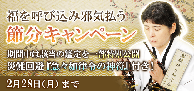 松田広子のサイトでは邪気を払い福を呼び込む『節分キャンペーン』を開催中。期間中は対象鑑定をご購入の皆様に、災難・不運を避ける『急々如律令の神符』画像をプレゼント。予期しない悪い事を避け、今よりも運が良くなるように念じさせていただきます。さらに対象鑑定の一部を特別公開しております。ぜひこの機会にご利用ください。