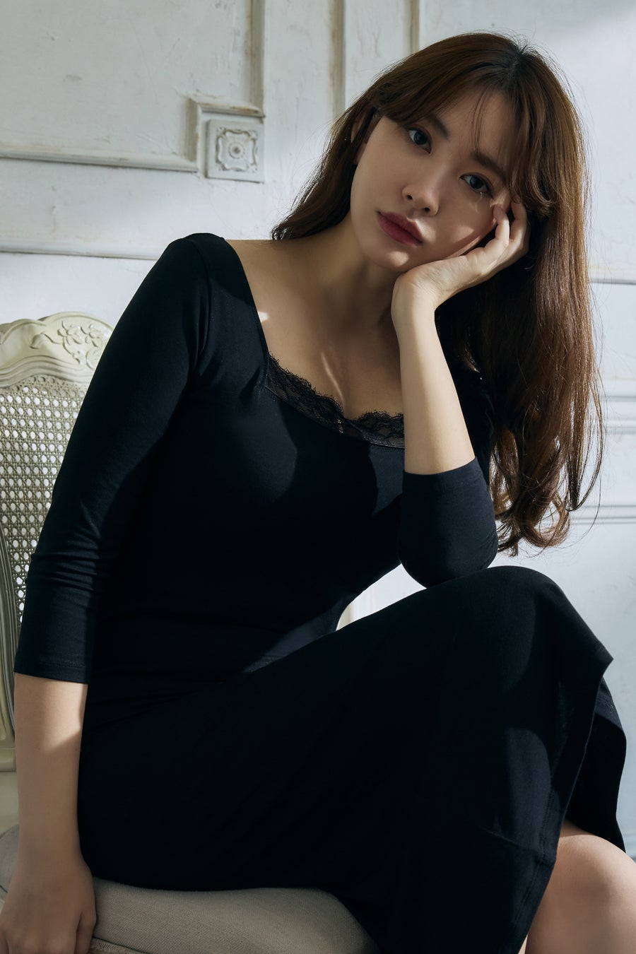 ネックラインは広めのスクエアネックに仕上げお洋服から見えにくい仕様に、デコルテ部分には艶のあるラインと繊細なレースをあしらい、女性らしいリュクスな印象をもたらします。
