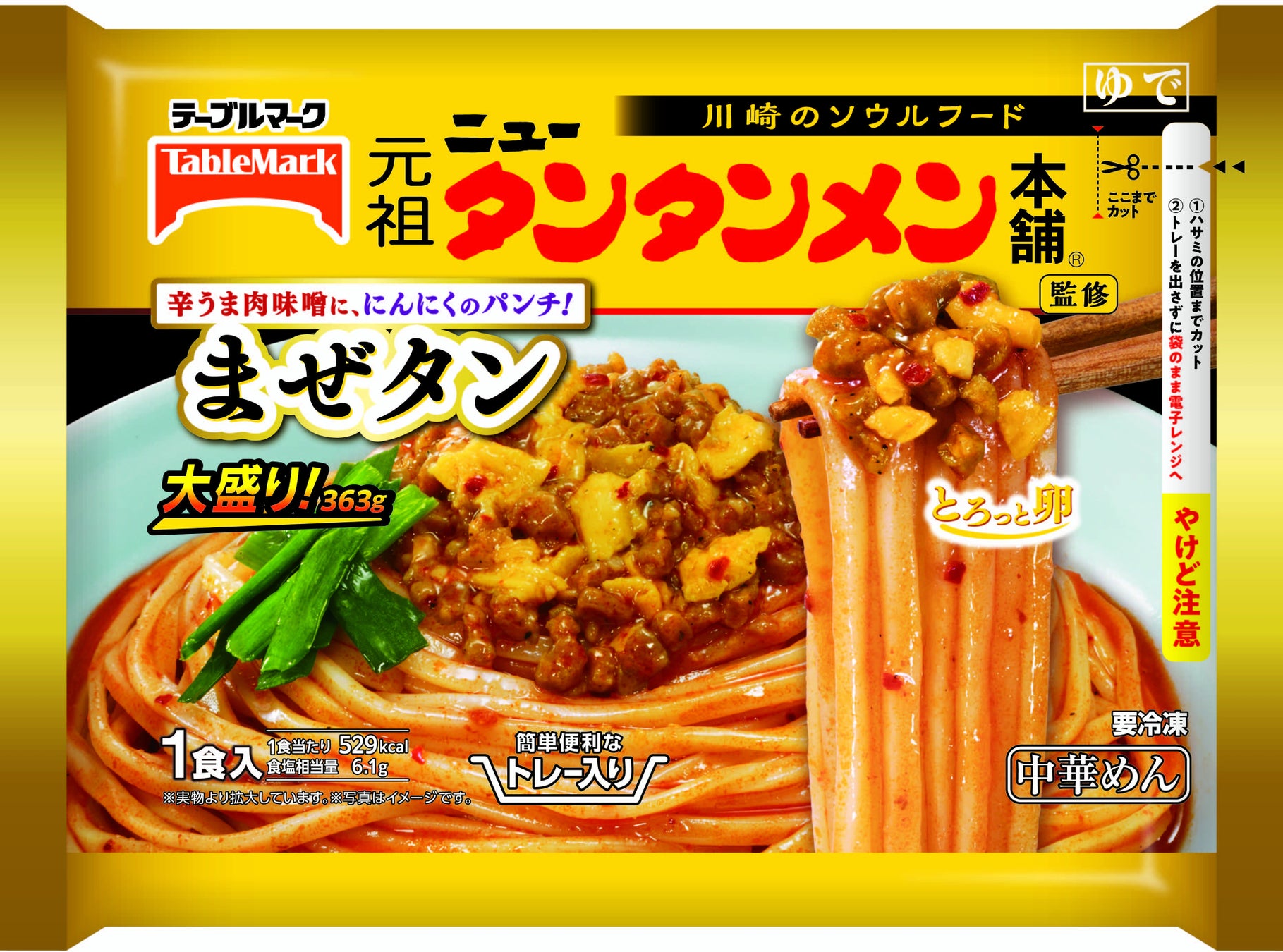 「元祖ニュータンタンメン本舗」監修のまぜそば登場!刺激的な唐辛子×にんにくのパンチのある味わいを卵と一緒に美味しくお召し上がりいただけます。トレー付&大盛りだから簡単便利で大満足な一品です!