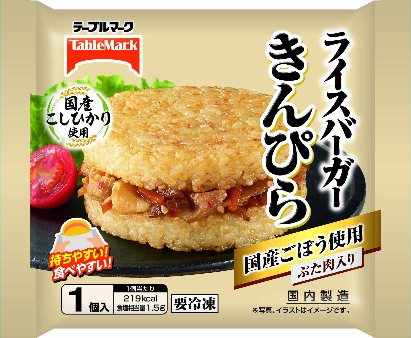 国産ごぼう、国産にんじんで作ったきんぴらと豚肉をライスバンズでサンドした和風のライスバーガー。国産ごぼうのシャキシャキ食感がアクセントになっています。ライスバンズはお米のおいしさにこだわり、国産こしひかり使用。しょうゆ、みりん等で味付けたライスバンズを、オーブンでこんがり焼き上げ、表面はカリっと、中はふっくらと仕上げました。