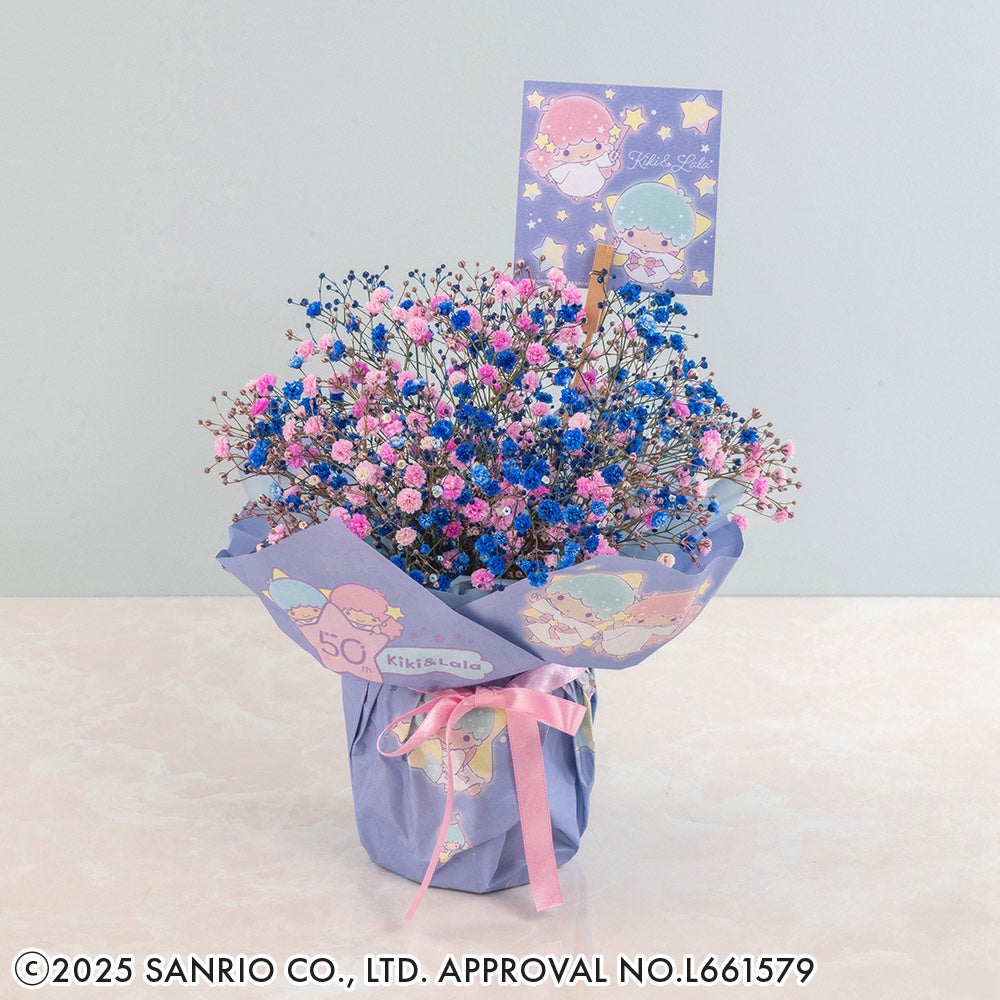 七夕の夜空に咲くキキ&ララの夢色ブーケ。ブルーとピンクのカスミソウが織りなすファンタジーな色合いは、キキ&ララのイメージにぴったりです。お手入れが簡単なスタンディングタイプのブーケは、花瓶いらずでそのまま飾っていただけるため、手軽で人気の商品です。さりげない贈り物やご自宅の七夕飾りにもおすすめです。