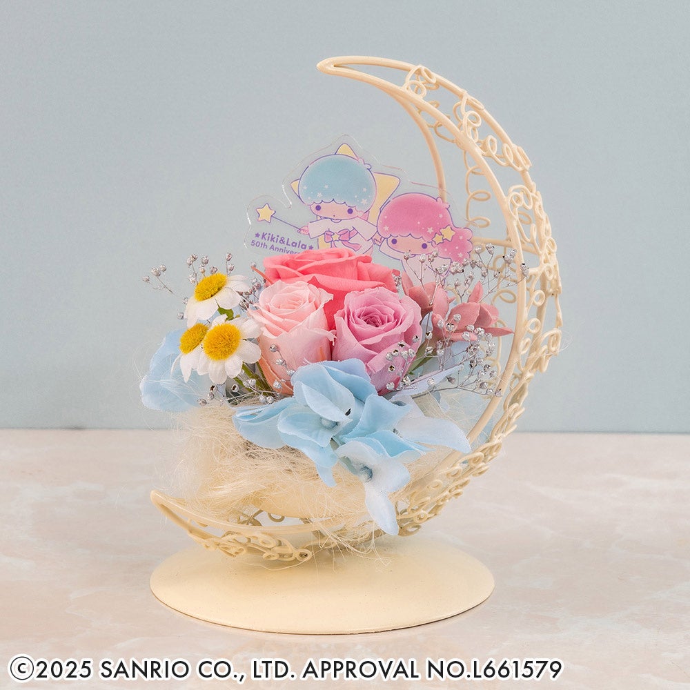 三日月の形をした繊細な器に、キキ&ララをイメージしたパステルカラーの優しい花々をふんわりとアレンジしました。まるで夜空をふわふわと飛び回るふたご星のように、夢と希望に満ちたデザインです。キラキラと輝くラメや星屑のようなかすみ草が、七夕のロマンチックな雰囲気を引き立てます。大切なあの人へ、またはご自身へのご褒美に。キキ&ララの世界観が詰まったメモリアルギフトはいかがですか。