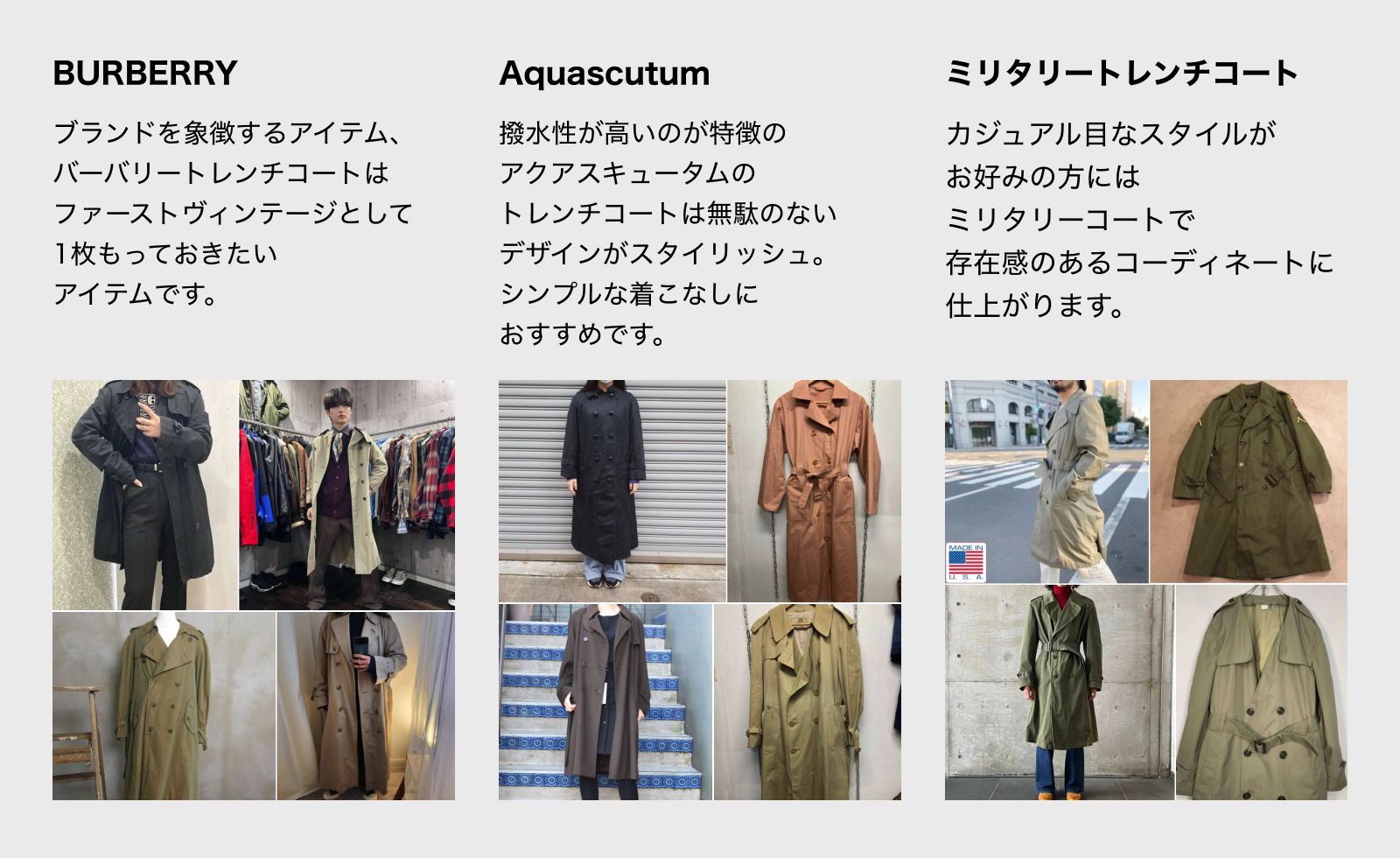 寒さも和らぎ暖かい陽射しの日も多くなってきました。春に向けてVintage.Cityでおすすめのアイテムは永遠の定番「トレンチコート」です。誰もが知る名作「バーバリートレンチコート」や機能性やデザイン性が高いブランドなど約300点のトレンチコートが出品中です。定番アイテムだからこそ回りと差をつけて古着の中から探してみるのはいかがでしょうか?
