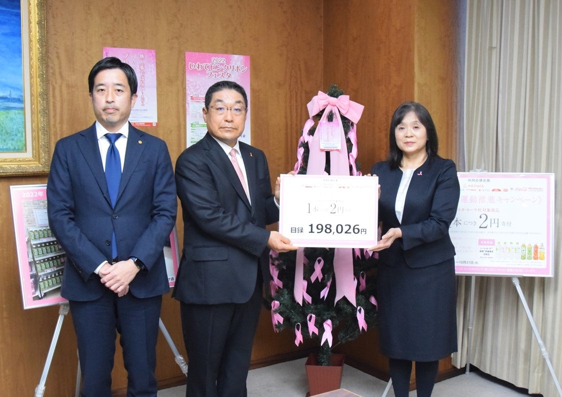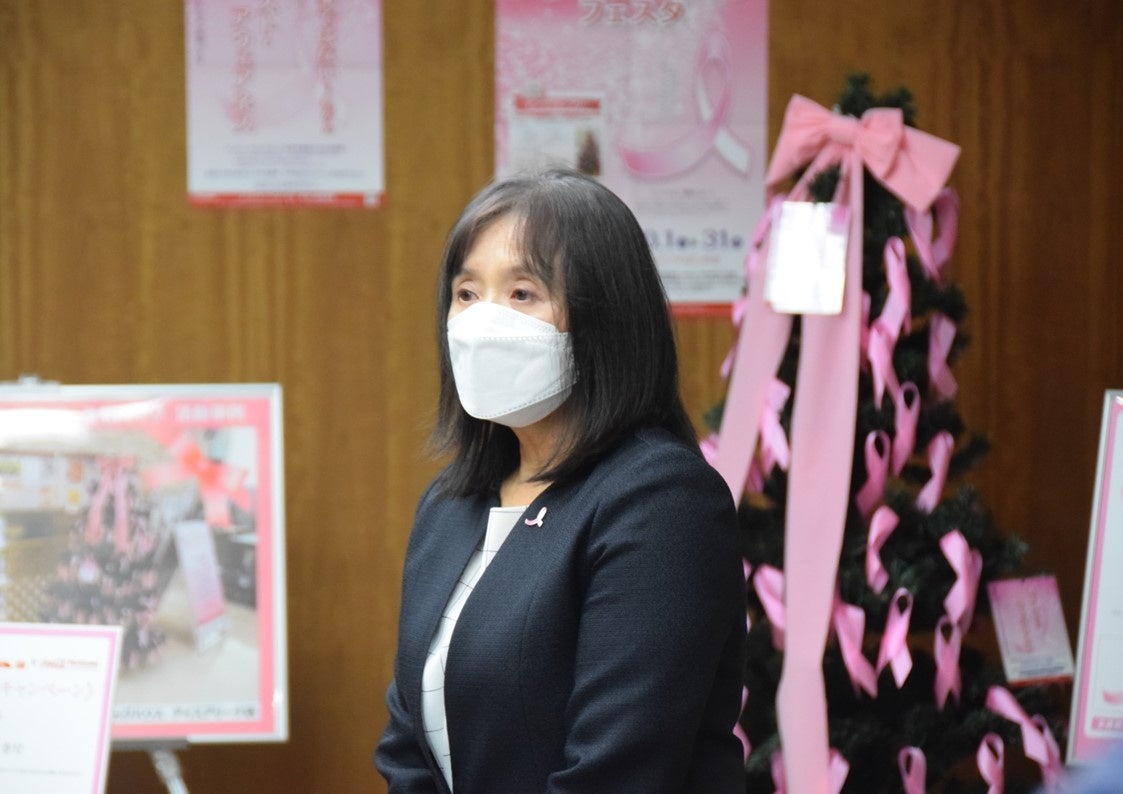 「乳がんに関しましては、早期発見・治療が何よりも重要だとお聞きしておりますので、このキャンペーンを推進していくことで、少しでも定期健診を受診する方が増え、岩手県における乳がんの死亡率が低下していくことを願っております。寄付金につきましては、県民の皆様のさらなる関心を高め、正しい認識を周知するための活動へ役立てていただければ幸いでございます。」