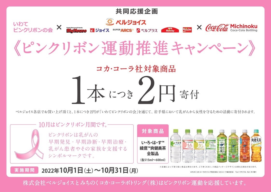 みちのくコカ・コーラボトリング、ベルジョイスとの共同キャンペーン「ピンクリボン運動推進キャンペーン」の売上の一部をいわてピンクリボンの会へ寄付