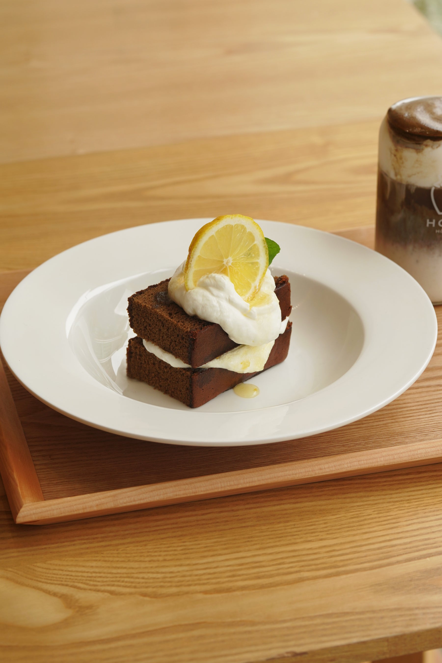 レモンがふわりと香り、濃厚な焙じ茶の味わいでありながらも、軽い食感で楽しめるデザートです。