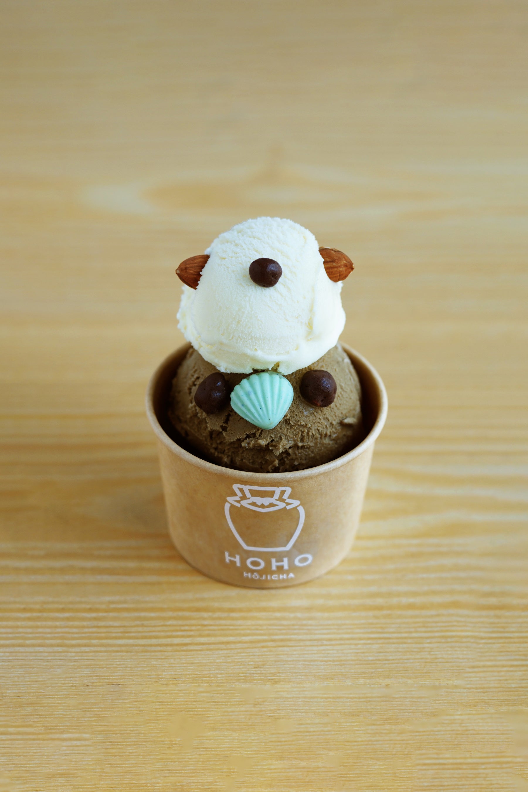 焙じ茶とバニラのジェラートにナッツでできた耳と、チョコレートの貝殻を飾り付け。