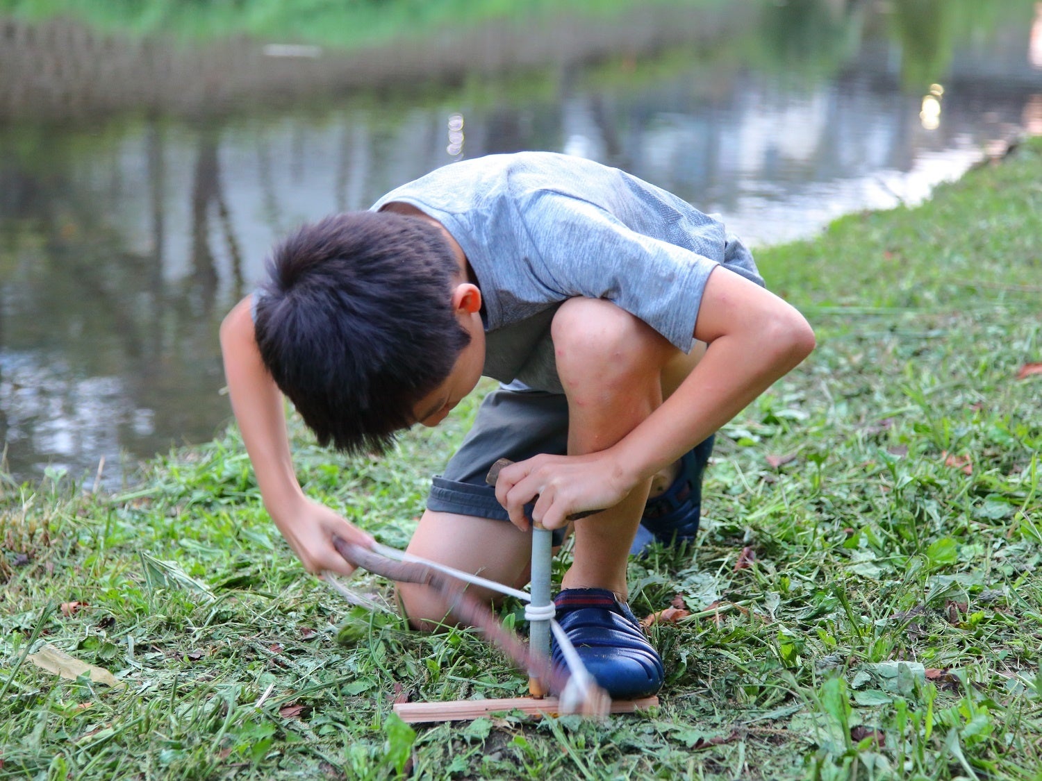 火起こしキットを使って、摩擦発火に挑戦!コツをつかむ難しさも感じながら、