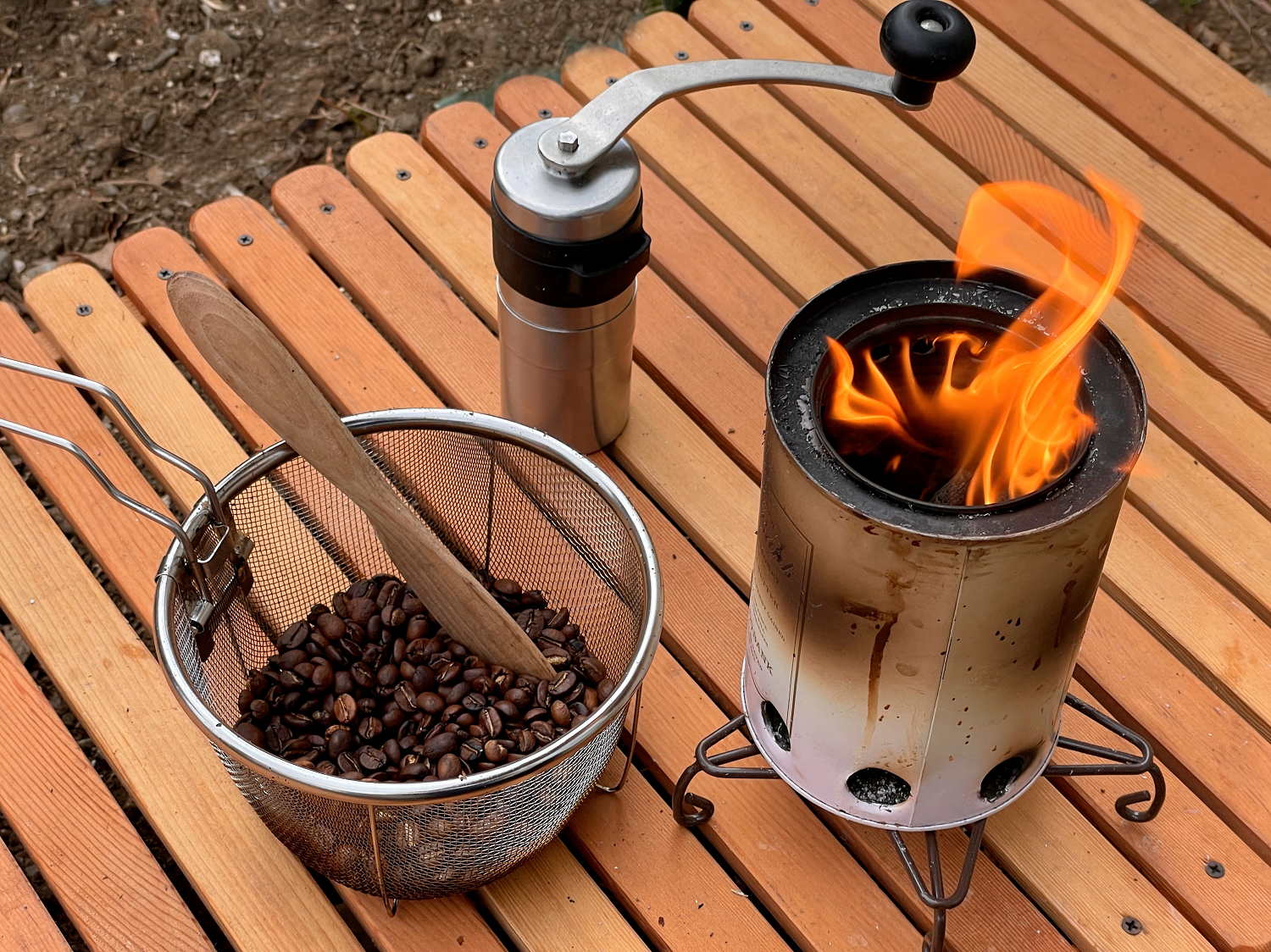 ウッドガスストーブに灯した火を使って、珈琲豆を焙煎できます。約20分かけて焙煎した後は、お湯を注いでその場でコーヒーブレイクをお楽しみいただけます。