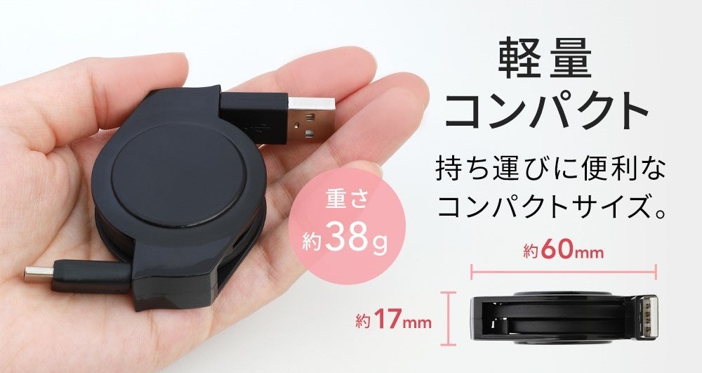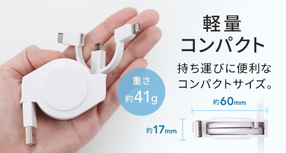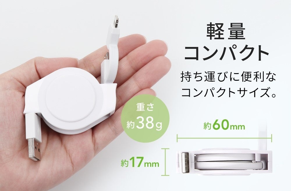 巻取り部分の構造の見直しや、ケーブルをより細くすることでコンパクト化を実現しました。巻取り式なので持ち運びに優れており、使用時もケーブルの長さを調節しながら引き出せるので、鞄の中や車内でもかさばりません。