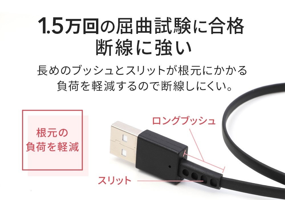 一番負荷のかかるコネクタ根元部分を強化したことで、日常生活で抜き差しする回数よりもはるかに多い15,000回の屈曲試験をクリア。