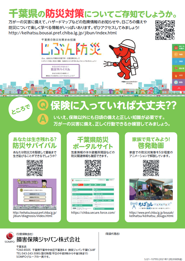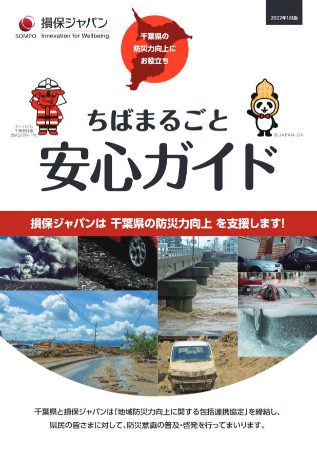 損害保険ジャパン株式会社(代表取締役社長:西澤 敬二、以下「損保ジャパン」)は、千葉県との「千葉県の地域防災力向上に関する包括連携協定」に基づいて千葉県の地域貢献取組みの一環として、防災パンフレット『ちばまるごと安心ガイド』を作成しました。