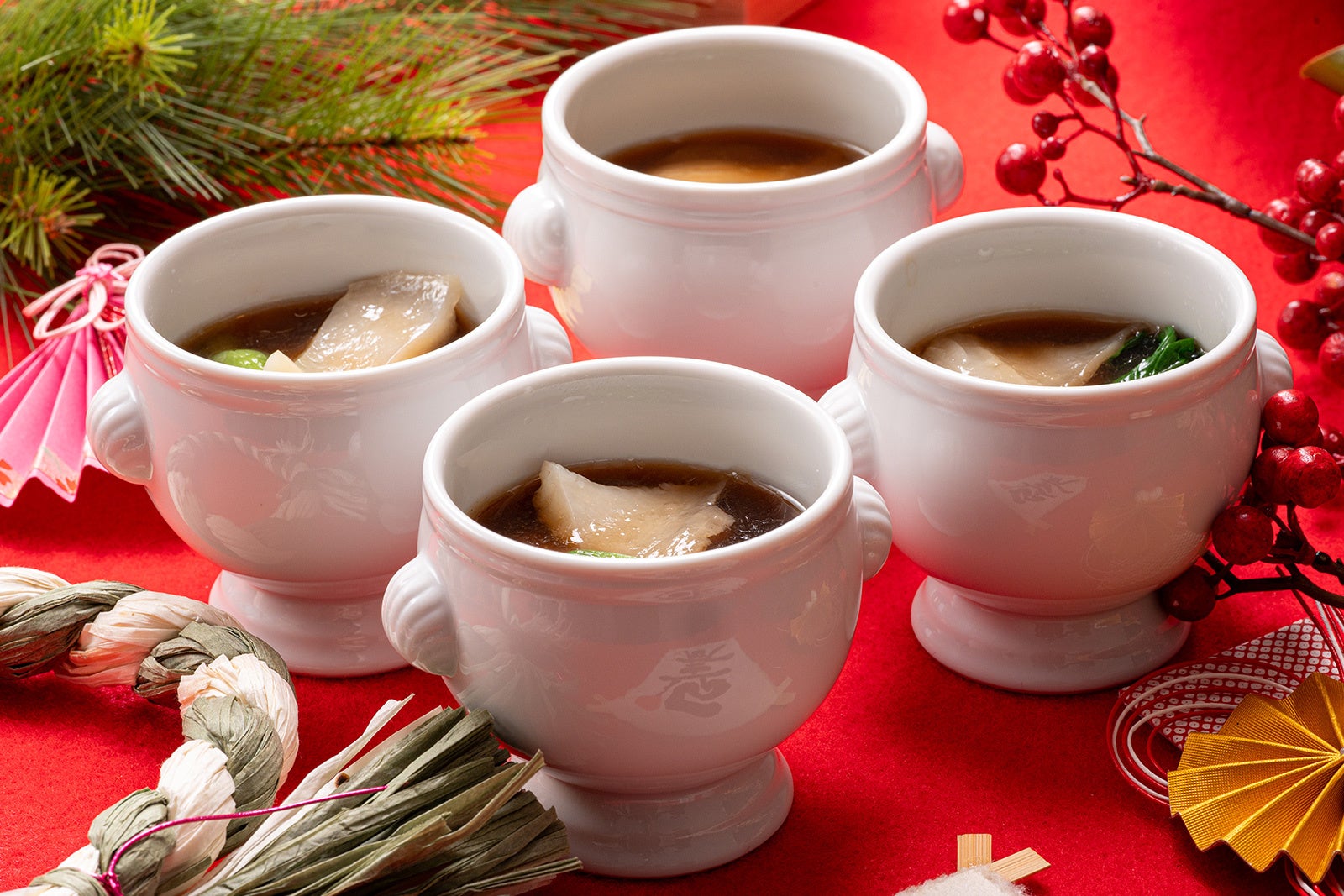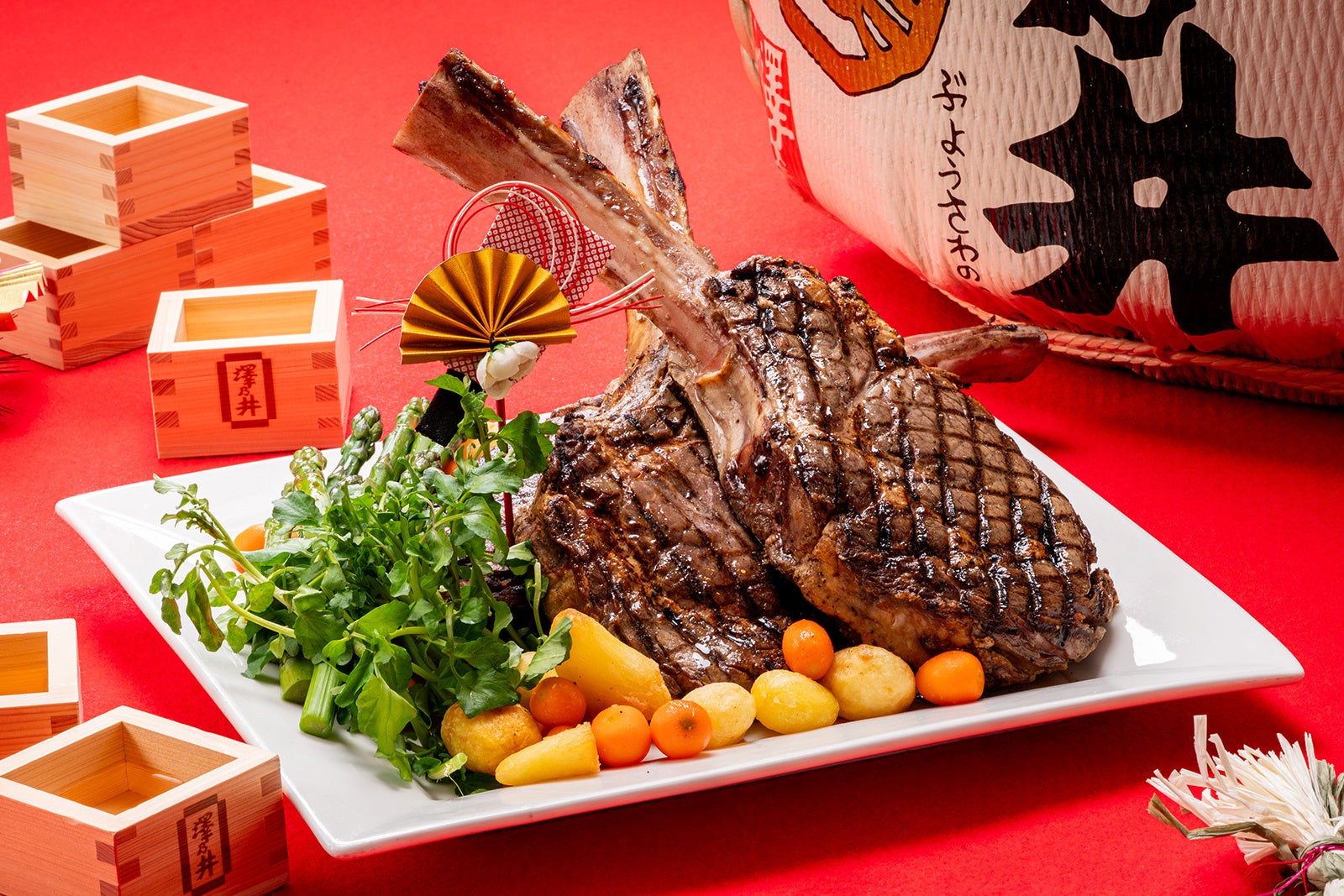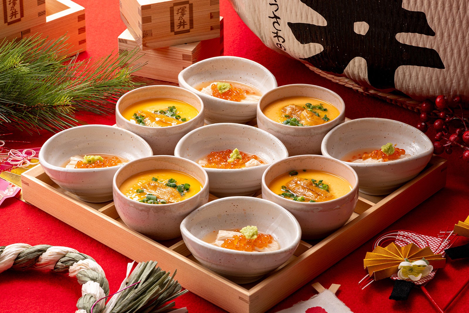 新年の幕開けにふさわしく、上質な食材を贅沢に使用した特別メニューをご用意いたしました。濃厚な旨みが広がる「ロブスター テルミドール」や、繊細な味わいの「湯葉といくら」、まろやかに仕上げた「ウニの冷製茶碗蒸し」など、旬の素材を丁寧に生かした逸品の数々をはじめ、「上海ガニとアワビの炒飯」や「フカヒレスープ」など、贅沢な食材の旨みを重ねた中華料理もご堪能いただけます。また、ライブキッチンでは、ボリューム感あふれる「トマホークステーキ」をシェフがその場で切り分け、香ばしい肉の香りとともに出来立ての美味しさをお届けいたします。さらに期間中は、新春を祝う「ふるまい酒」として、奥多摩の銘酒〈澤乃井〉をご提供。彩り豊かな料理の数々とともに、新春のひとときをご堪能ください。